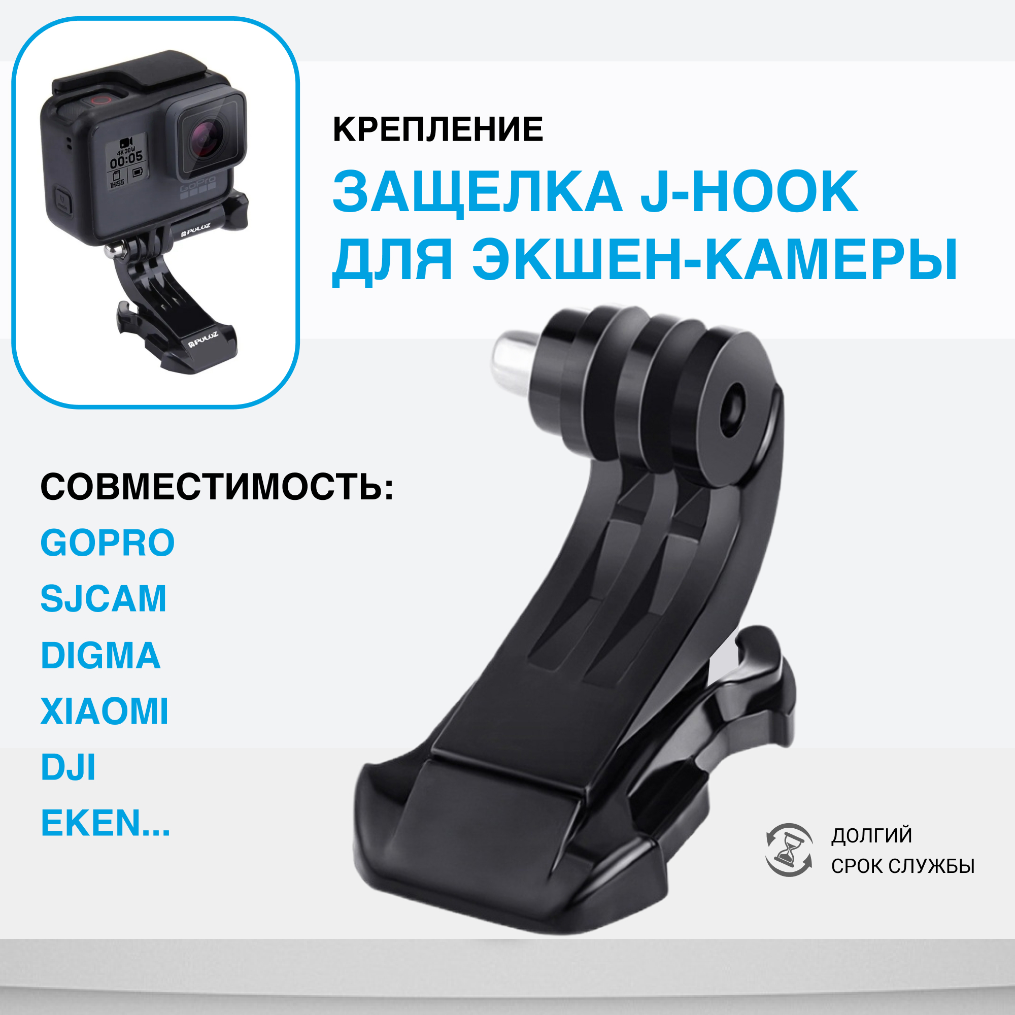 Модель актуальна для фиксации техники большинства ведущих производителей, включая DJI, SJCAM, Xiaomi, GoPro, Digma и других. Если стандартная защёлка не позволяет обеспечит горизонтальный ракурс для видеозаписи, то вертикальное крепление камеры J-Hook легко устраняет этот недостаток крепежных элементов.