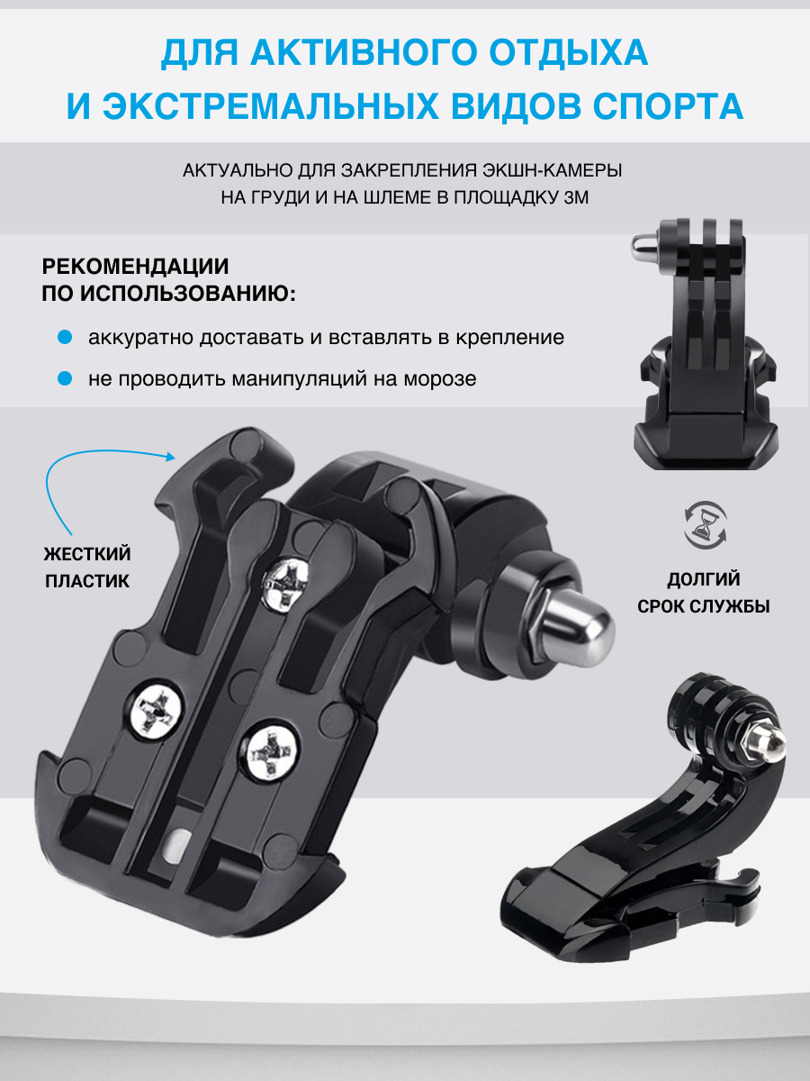 Описание: Если вам нужно зафиксировать и поднять камеру над плоскостью, крепление-защёлка J-Hook отлично справится с этой задачей. К примеру, такое крепление экшн-камеры актуально для спортсменов, крепящих устройство на груди. Можно более удобным образом отрегулировать, под каким углом наклона камера будет вести съёмку.