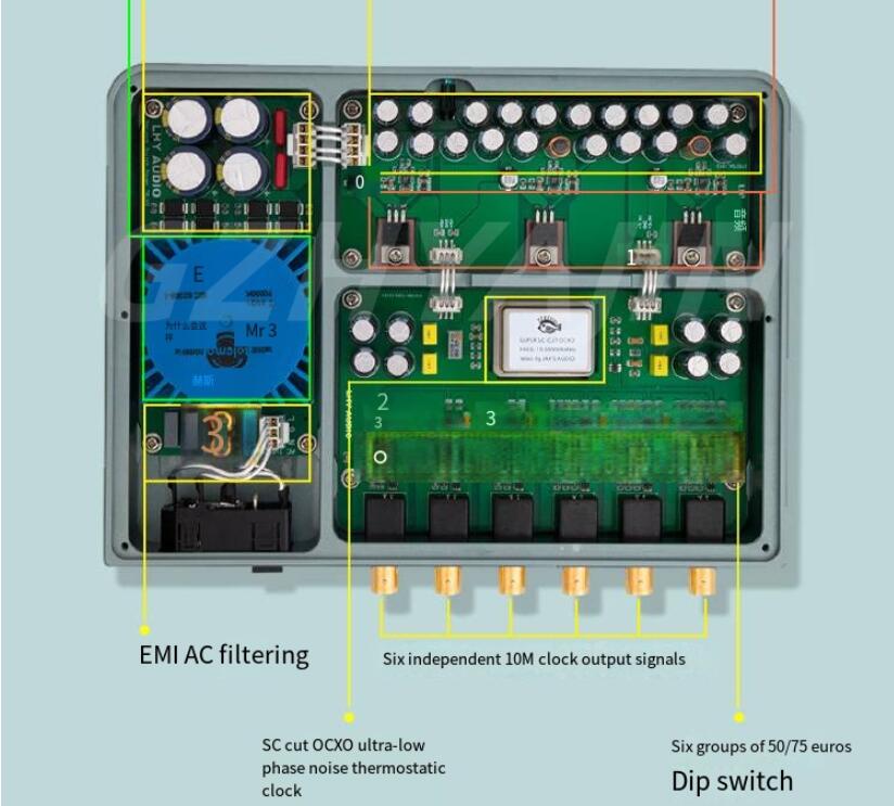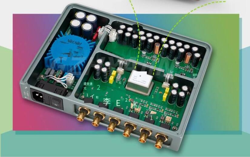 Чистый Линейный источник питания, шум близок к 0. Фильтр EMI + Британский трансформатор талемы мощностью 15 Вт + высокоскоростной выпрямительный фильтр для максимальной мощности часов со сверхпостоянной температурой, три независимых архитектуры LT3042 + PNP обеспечивают источник питания на уровне УФ для кварцевого генератора, опорная схема частотной модуляции и выход материнской платы, что в значительной степени способствует генерации ключевых часов и высокоточного вывода.