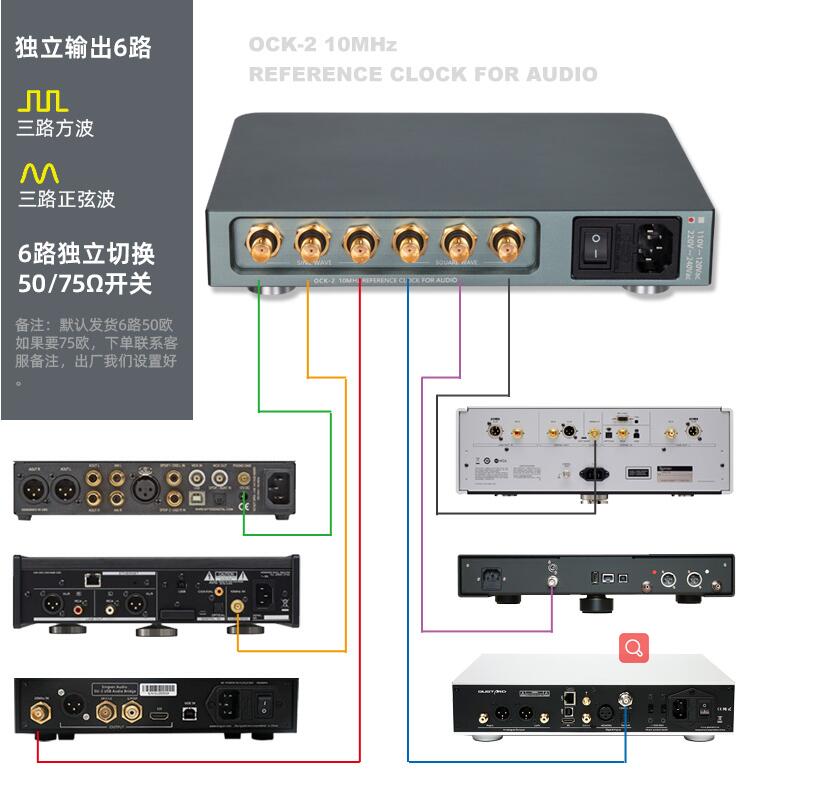 Задняя Панель оснащена до 6 устройствами, поддерживающими вход 10 м, включая Сетевой проигрыватель USB-ЦАП и проигрыватель SA-CD, которые можно подключать параллельно. Каждый 6-полосный выход имеет дисковой переключатель для переключения 50/75 Ом. Поскольку циферблатный переключатель является внутренним, необходимо заранее договориться со службой поддержки клиентов о заводских настройках. Заводская настройка по умолчанию-6 направлений 50 Ом. Каждая группа цепей OCK-2 вывода от части источника питания на буферный драйвер ступени разработана с изоляцией для предотвращения перекрестных помех и мерцания при подключении нескольких устройств к интерфейсу BNC. Добавляя драйвер буфера в каждую цепь, когда все шесть групп тактовых сигналов были сгенерированы, используются совместно, форму сигнала нелегко затухнуть. Следовательно, каждый выход интерфейса BNC обеспечивает тактовый сигнал сверхвысокой точности 10 МГц.