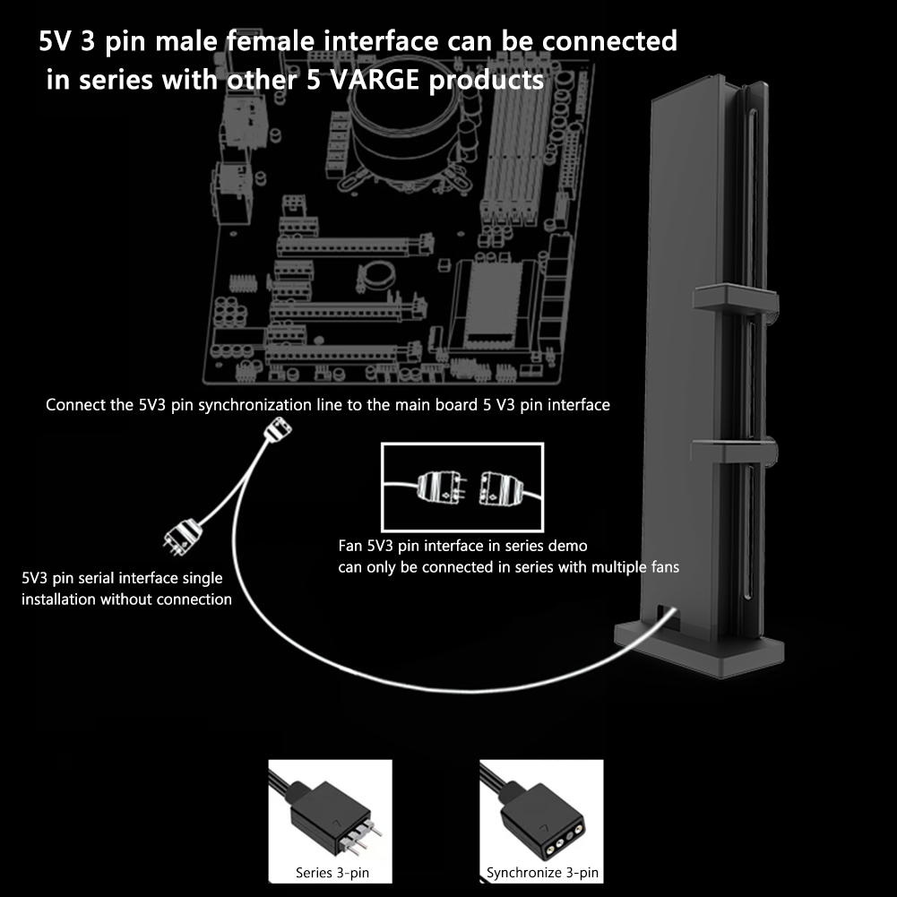 Учебное пособие: 3-контактный Штекерный женский интерфейс 5 В может быть подключен последовательно с другими продуктами 5 В ARGB. 3-контактный синхронный кабель 5V подключается к 3-контактному интерфейсу 5V основной платы. 3-контактный интерфейс вентилятора 5V можно подключить последовательно только при наличии нескольких вентиляторов. 3-контактный последовательный интерфейс 5 В не требуется для однократной установки.
