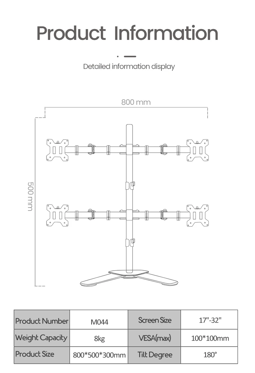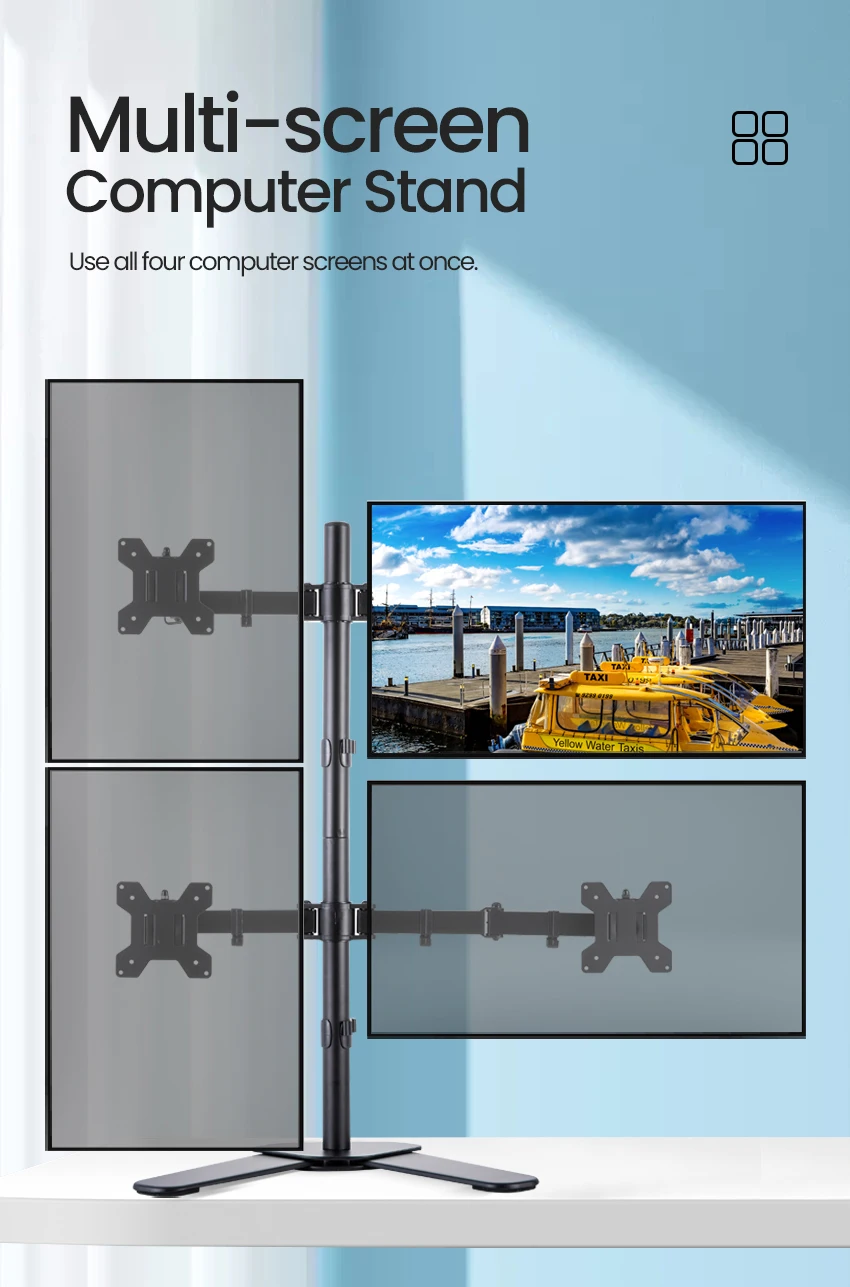 1. Крепкий стальной четырехъядерный стол с креплением на четыре экрана сбоку, чтобы удобно освободить место для стола. Вмещает четыре телевизора 17-32 дюйма или мониторы с максимальной грузоподъемностью 8 кг для каждой руки