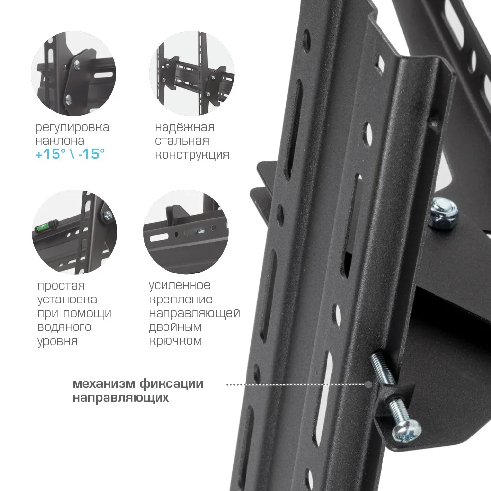 Наклонный рамный кронштейн изготовлен из стали и способен выдерживать нагрузку до 55 кг, что делает его универсальным решением, как для старых плазменных панелей, так и для современных больших QLED/OLED/LED/LCD телевизоров.