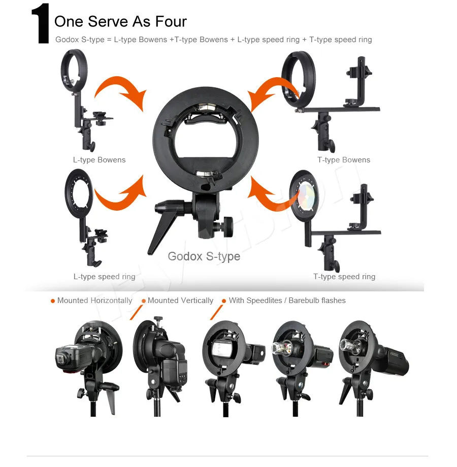 -S-образный кронштейн сочетает в себе другие четверки (l-тип Bowens, t-тип Bowens, l-тип скоростного кольца, t-тип скоростного кольца).