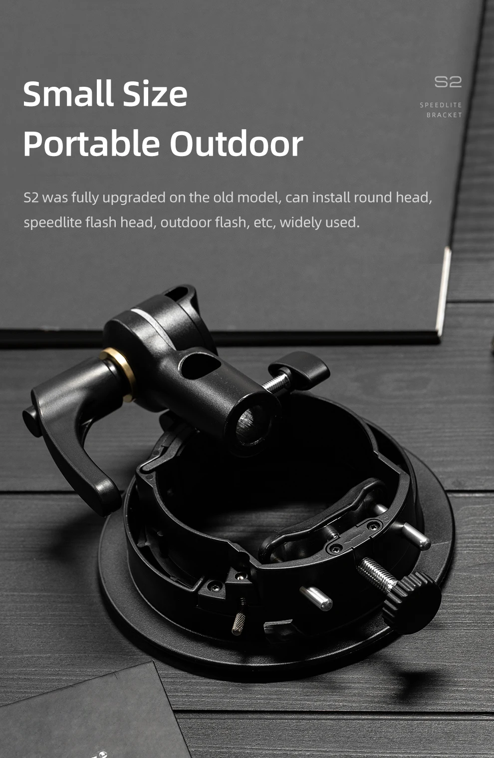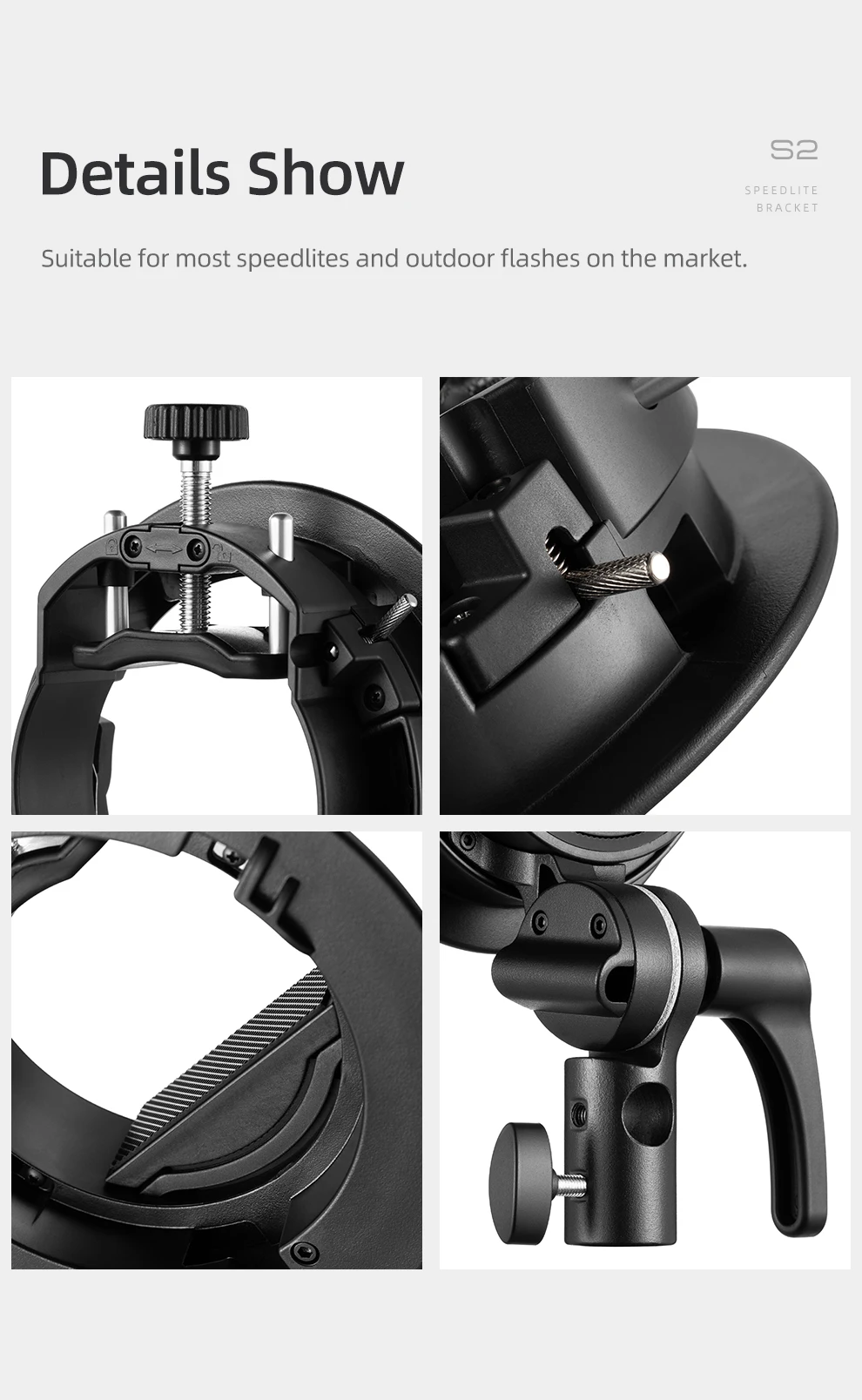 Как оптимизированный запатентованный продукт, кронштейн speedlite Godox S-type превосходит: все-в-одном, меньший размер, портативный дизайн, без сборки/разборки и простой системы крепления. Быстро добавьте аксессуары для освещения с креплением Bowens, чтобы получить креативные световые эффекты.