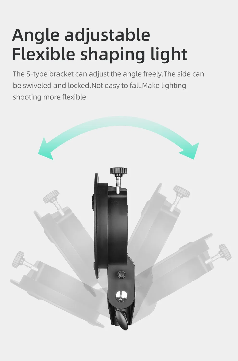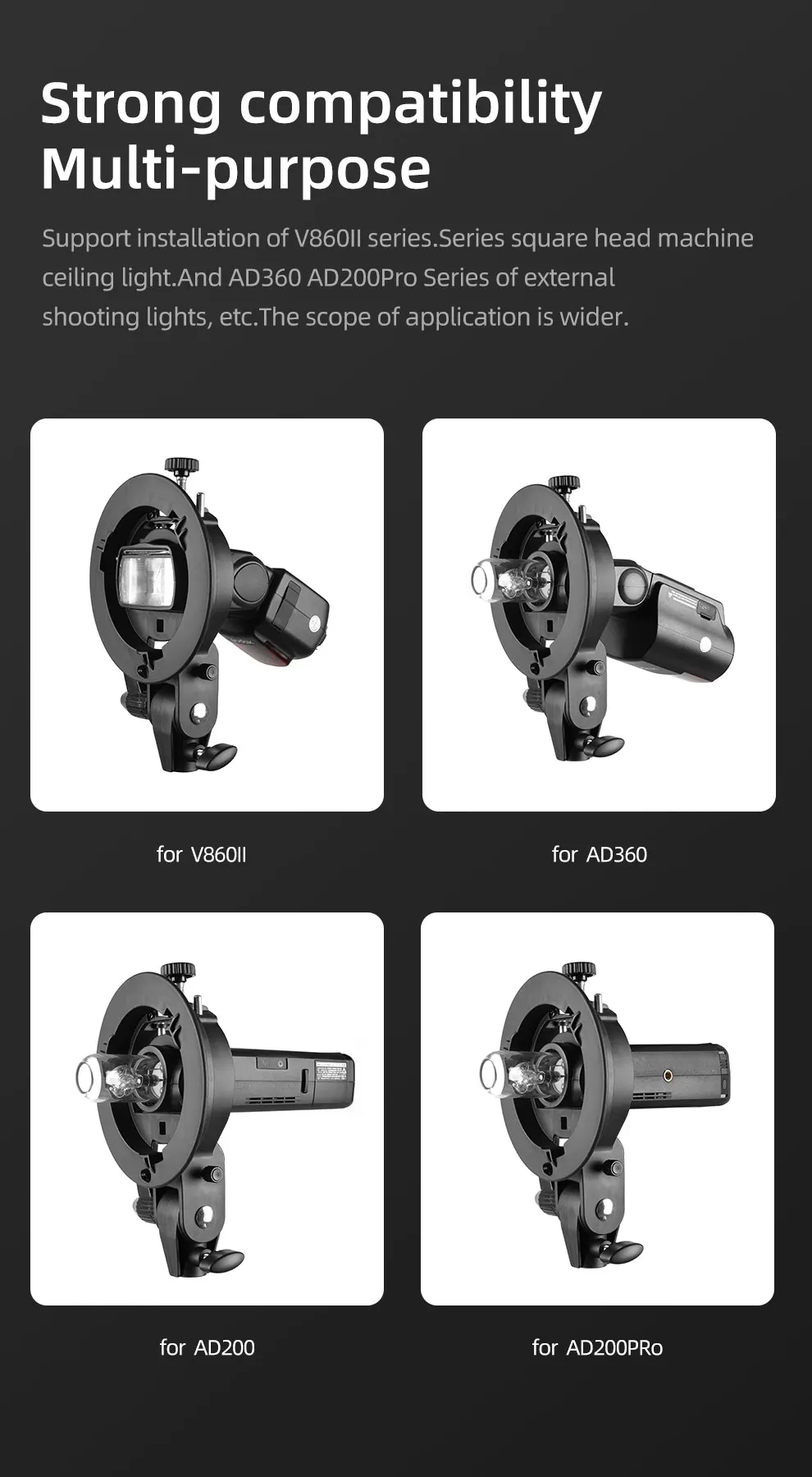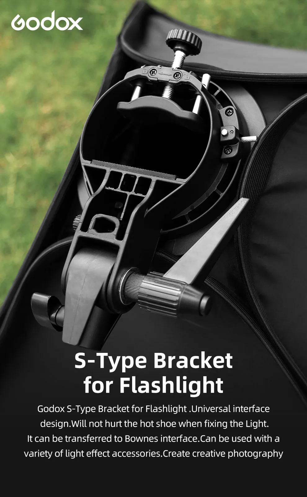 Как оптимизированный запатентованный продукт, кронштейн speedlite Godox S-type превосходит: все-в-одном, меньший размер, портативный дизайн, без сборки/разборки и простой системы крепления. Быстро добавьте аксессуары для освещения с креплением Bowens, чтобы получить креативные световые эффекты.