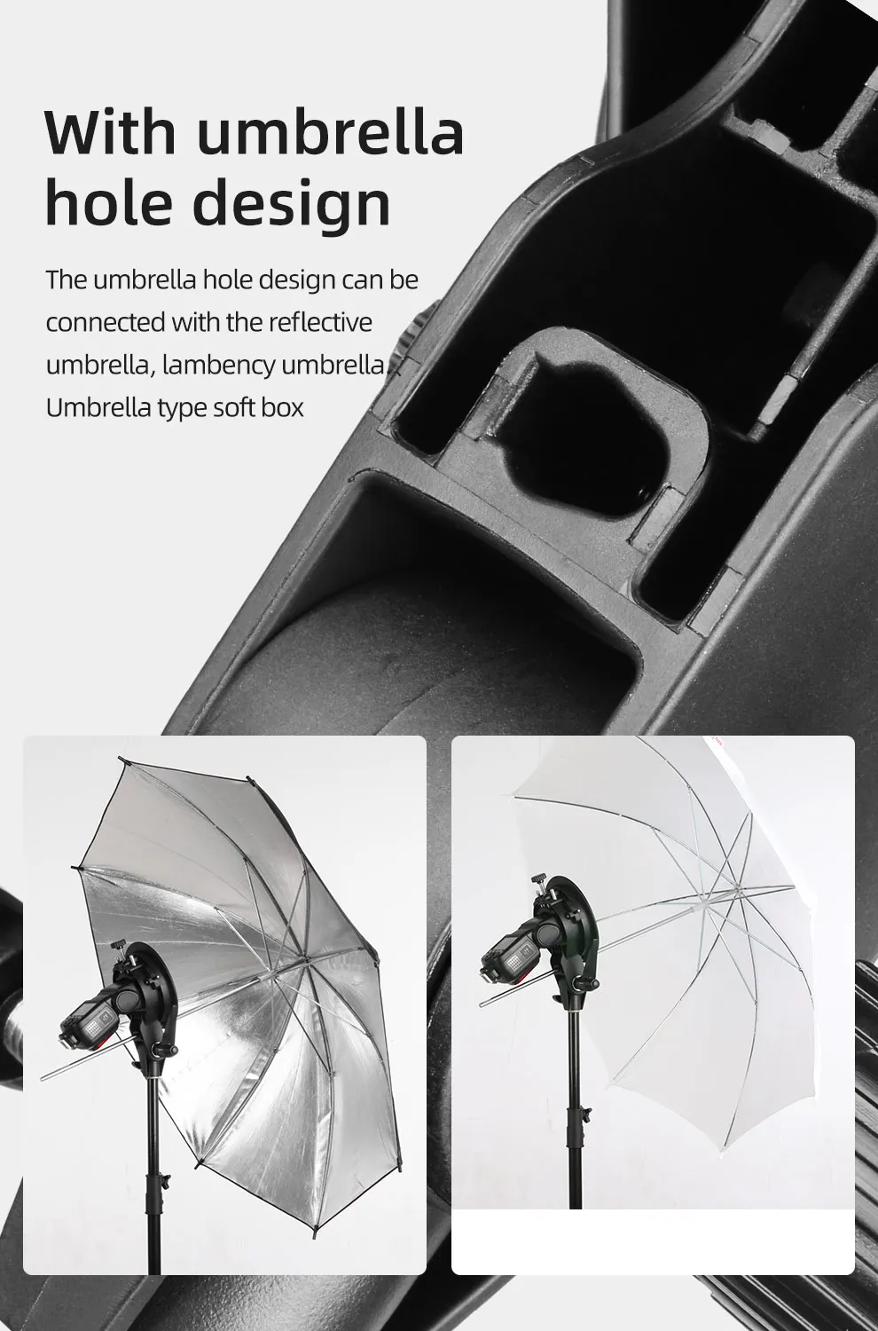 Функции: с креплением Bowens, скоростным кольцом, входом зонта, регулируемой ручкой направления, горизонтальной подвижной способностью.