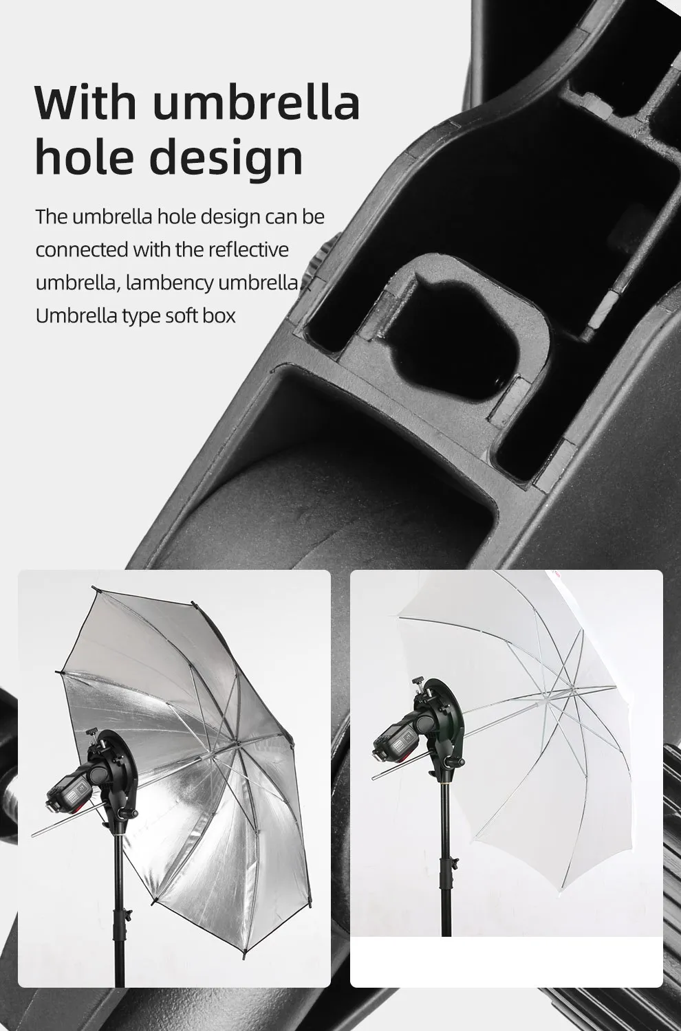 Функции: с креплением Bowens, кольцом скорости, входом зонта, ручкой с регулировкой направления, возможностью горизонтального перемещения.