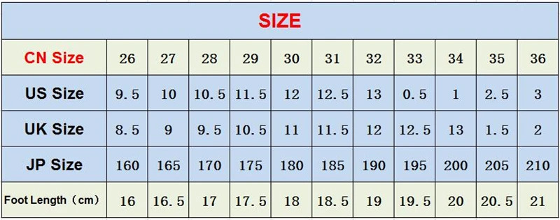 Это не европейский размер.Пожалуйста, выберите размер в соответствии с длиной стопы, как показано в таблице размеров ниже. Основываясь на опыте, мы предлагаем вам выбрать на один размер больше, потому что ваш ребенок быстро вырастет.