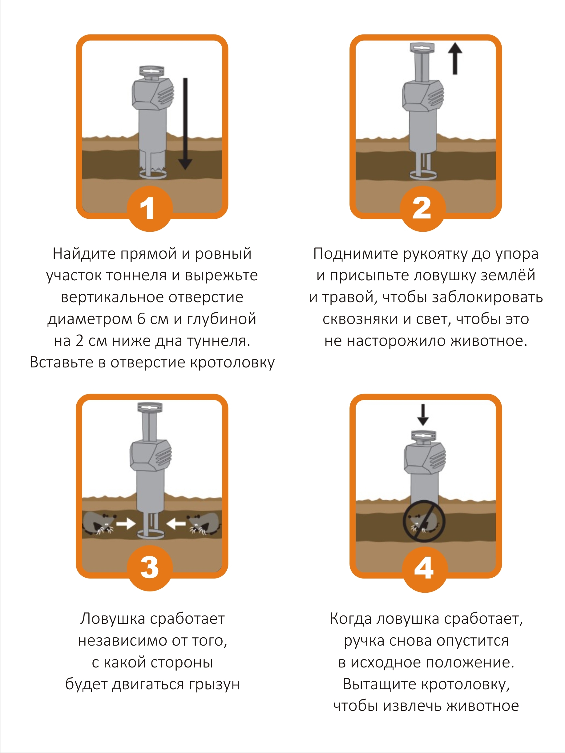 БЫСТРАЯ И ПРОСТАЯ УСТАНОВКА. Установка занимает всего несколько минут. Просто найдите туннель, вырежьте ножом ямку, опустите в нее ловушку,и поднимите ручку до упора.
