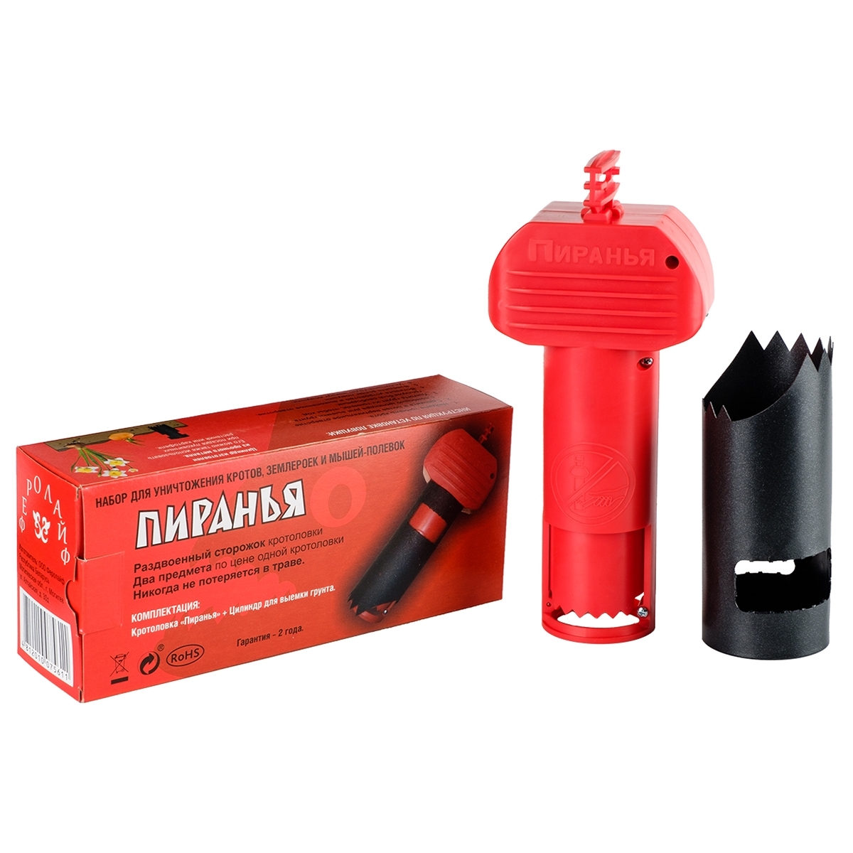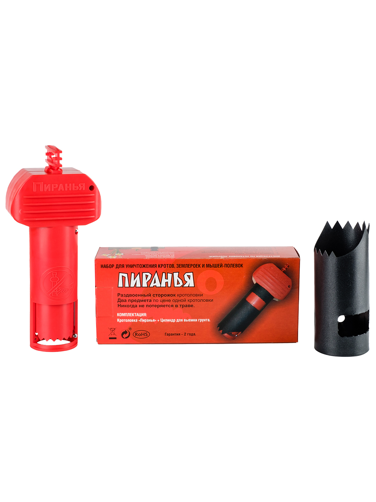 В комплекте поставки «Пиранья» – не только кротоловка, но и наш дополнительный аксессуар – уникальный металлический цилиндр со скошенным рядом зубьев (для легкого удаления земли). Это удобно и очень выгодно. Вы приобретаете сразу 2 предмета по цене одной кротоловки.