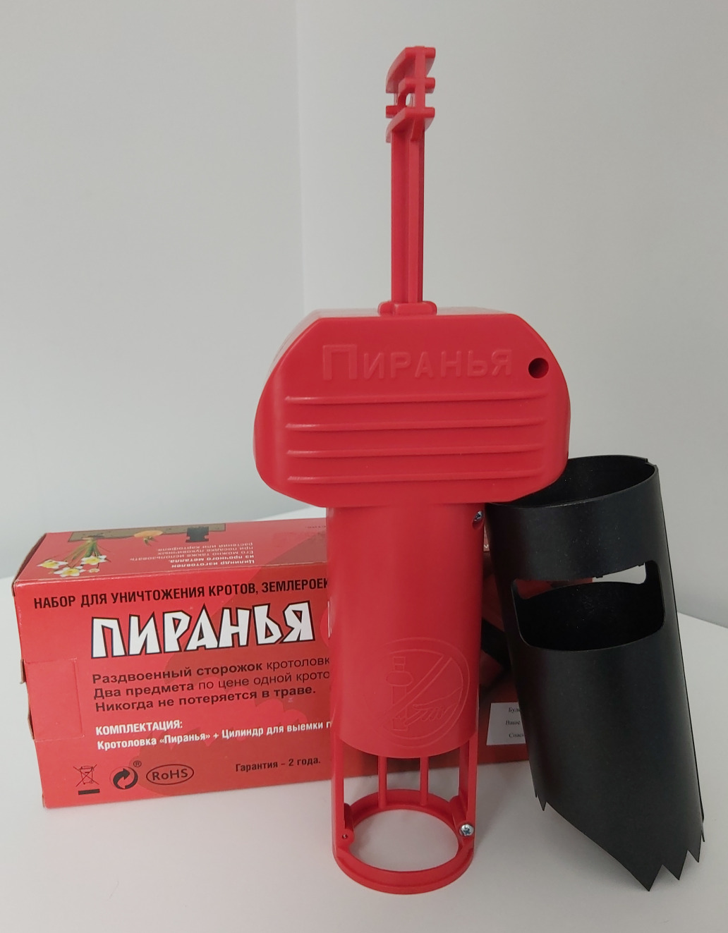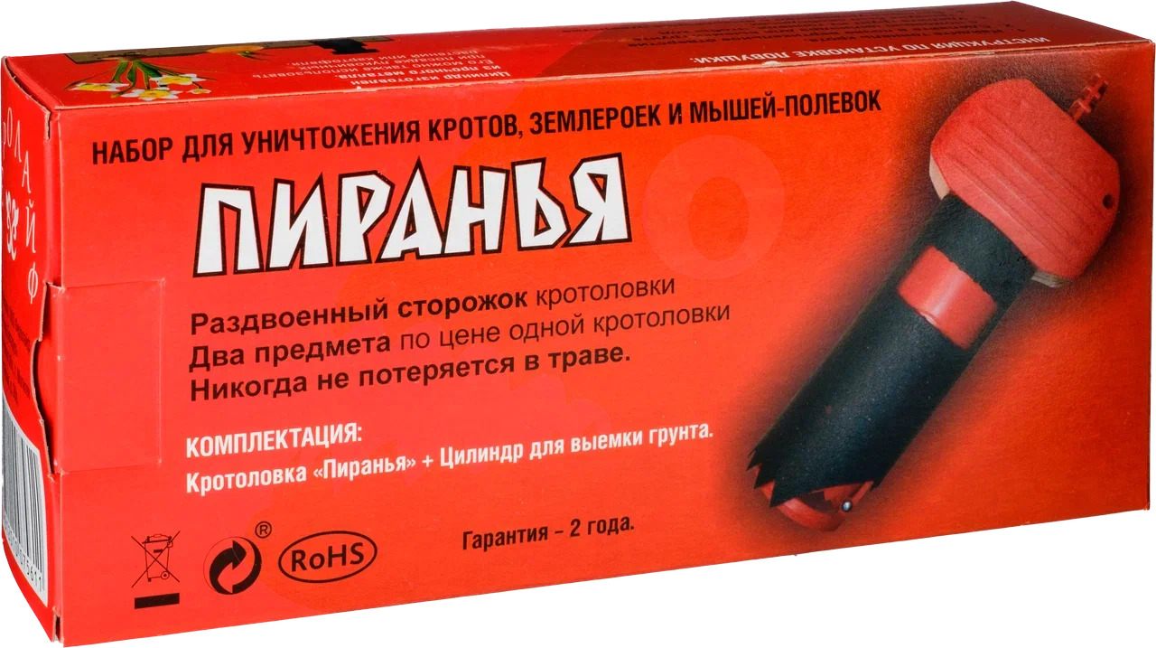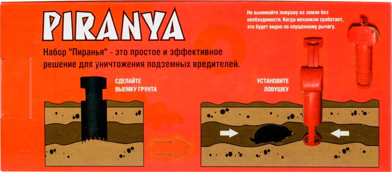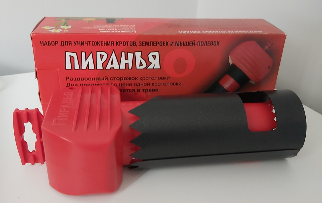Описание: кротоловка пираньяПиранья - кротоловкаКротоловка капкан Красная Пиранья. Комплект (2 в 1). Полный набор для ловли подземных грызунов. Пиранья - ловушка грызуновОписаниеВ комплекте Пиранья – не только пластиковая ловушка, но и дополнительный аксессуар – уникальный металлический цилиндр со скошенным рядом зубьев (для более легкого удаления земли). Это – удобно, и это очень выгодно.