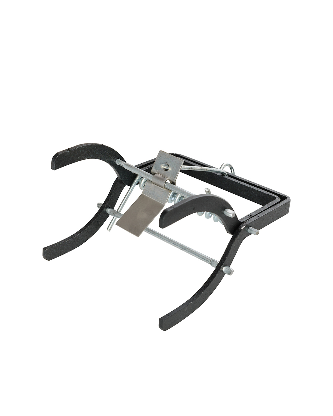 • Разместите ловушку непосредственно внутри хода. Держите ее за верхнюю часть, чтобы не получить повреждения рук. Спусковая скоба размещается в толще осыпанной земли, перекрывающей ход крота. Важно, чтобы линия движения крота проходила между взведенных "клешней" кротоловки.