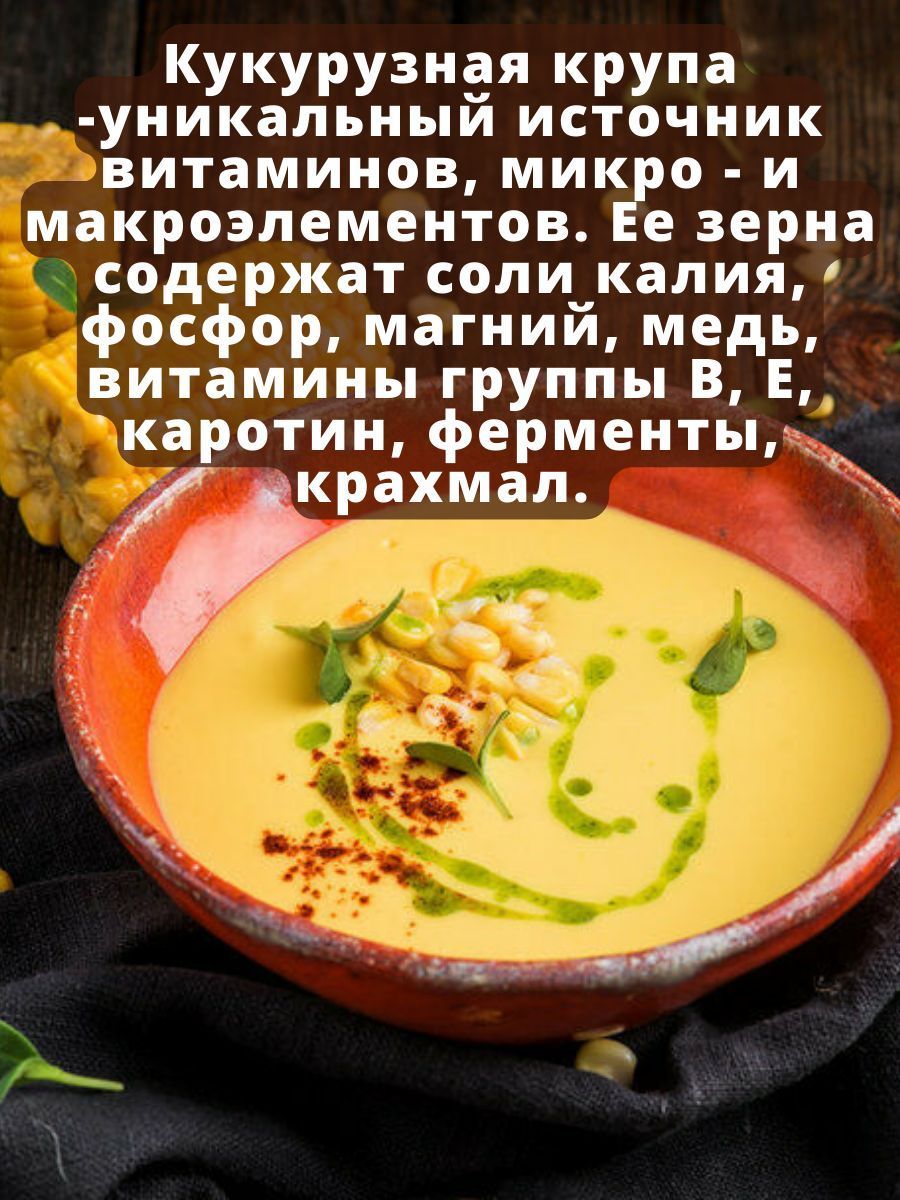 Описание: Кукуруза, как продукт питания, имеет множество преимуществ и ценных питательных свойств. Кукурузная крупа, каша и суп являются вкусными и питательными продуктами, которые могут быть дополнением к здоровому рациону как для взрослых, так и для детей.
