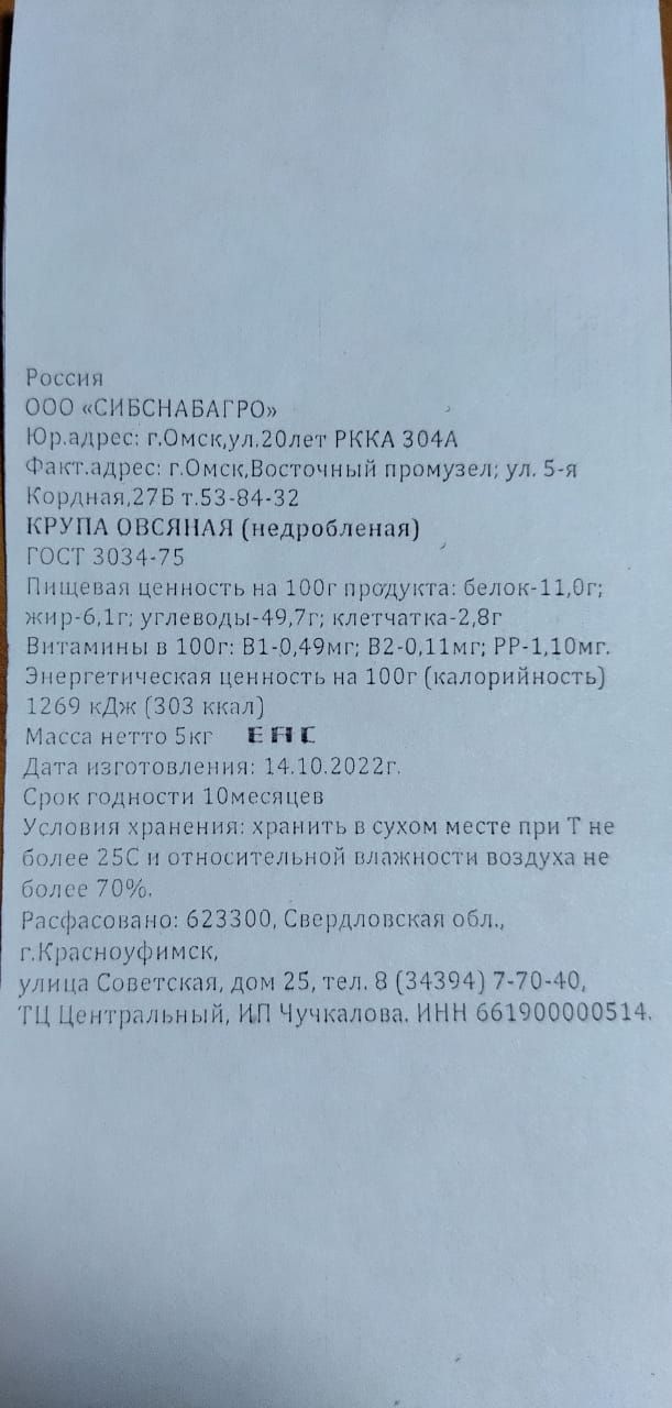 Описание: ДАТА ВЫРАБОТКИ НА ФОТО НЕ АКТУАЛЬНА, ОТГРУЖАЕМ СО СВЕЖИМИ СРОКАМИ!!! Овсяная крупа содержит высококачественный легкоусвояемый растительный белок, необходимый для строительства клеток организма. Продукт богат пищевыми волокнами, которые не растворяются в пищеварительном тракте, набухают и мягко соскребают со стенок кишечника шлаки, продукты распада, не повреждая поверхности и слизистые. Овсяная крупа имеет в составе крахмал, сбалансированный комплекс аминокислот, практически все витамины группы В, защищающие нервные клетки и благотворно влияющие на обменные процессы и состояние кожных покровов и волос. В овсянке содержатся антиоксиданты – вещества, которые повышают сопротивляемость организма к негативным воздействиям окружающей среды и инфекциям. Овсяная крупа имеет свойство уменьшать всасывание сахаров и стабилизировать уровень сахара в крови. Широко применяется в диетологии.