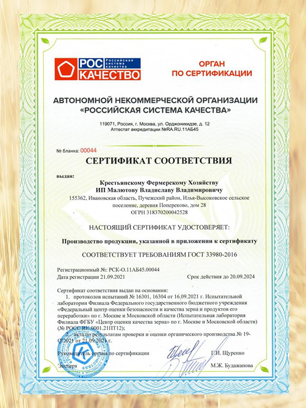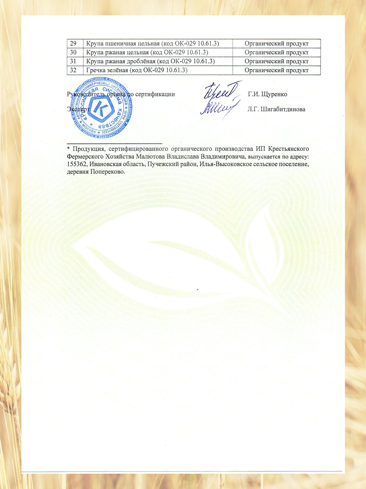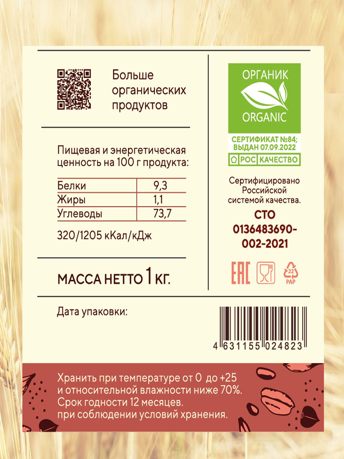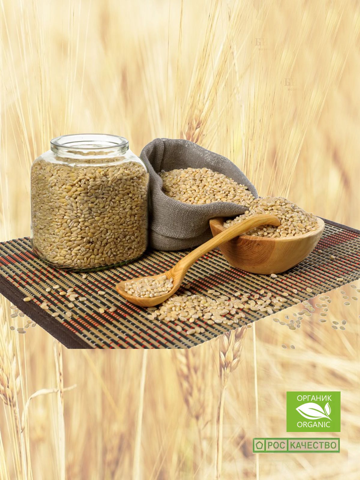 Зерно ячменя. Продукт изготовлен из экологически чистого зерна, выращенного по принципам органического земледелия без использования нитратов, пестицидов, средств защиты растений, минеральных удобрений с применением минимальной обработки почвы.