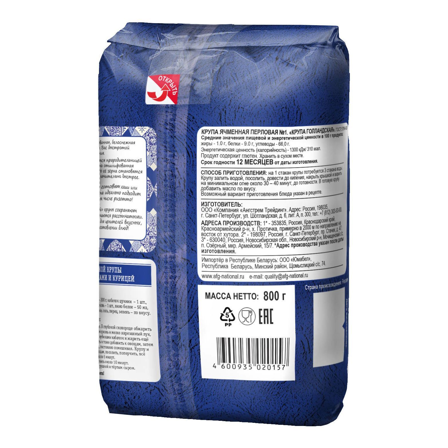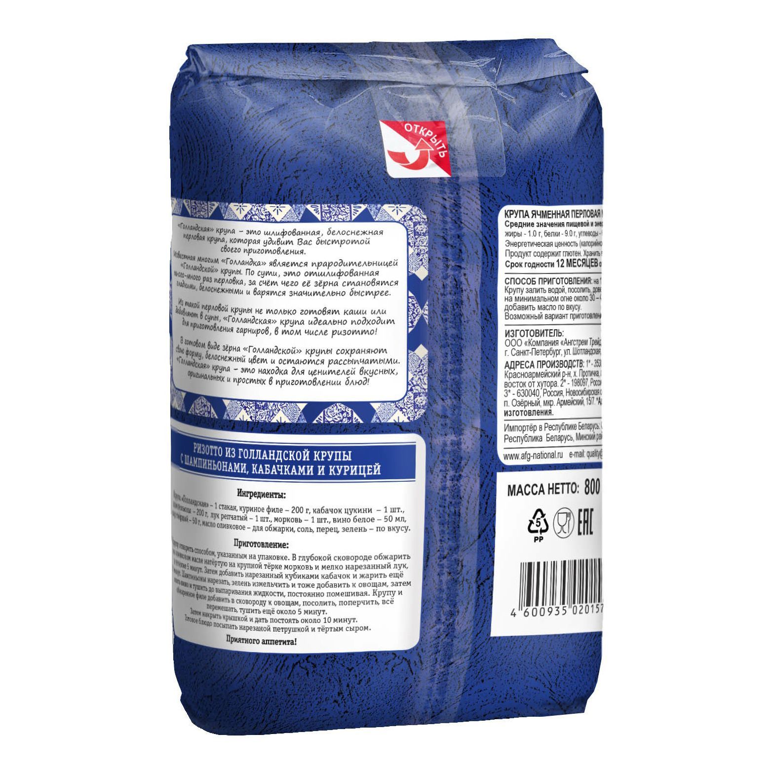 Голландская крупа – это шлифованная, белоснежная перловая крупа, которая удивит Вас быстротой своего приготовления. Известная многим Голландка является прародительницей Голландской крупы. По сути, это отшлифованная много-много раз перловка, благодаря чему ее зерна становятся гладкими, белоснежными и варятся значительно быстрее. Из такой перловой крупы не только готовят каши или добавляют в супы, Голландская крупа идеально подходит для приготовления гарниров, в том числе перлотто! В готовом виде зерна Голландской крупы сохраняют свою форму, белоснежный цвет и остаются рассыпчатыми. Голландская крупа – это находка для ценителей вкусных, оригинальных и простых в приготовлении блюд!