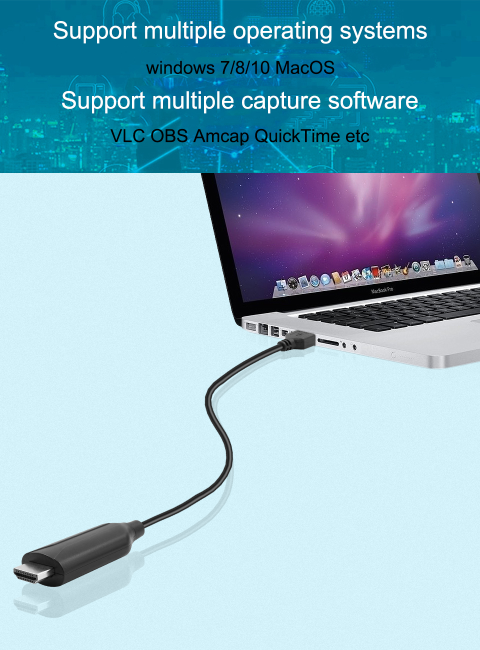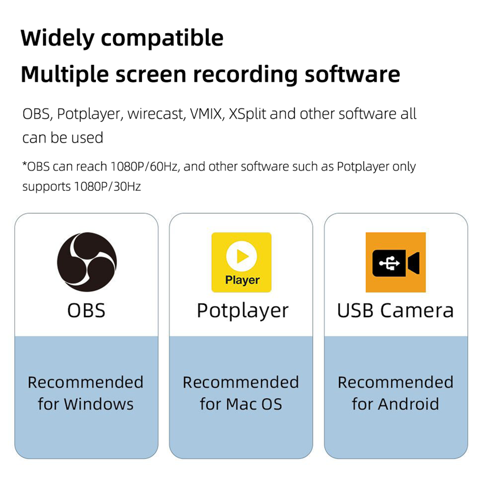 * Поддержка большинства программ для сбора данных, таких как VLC< OBS. Amcap и т. Д.; * Поддержка Windows и MacOS;