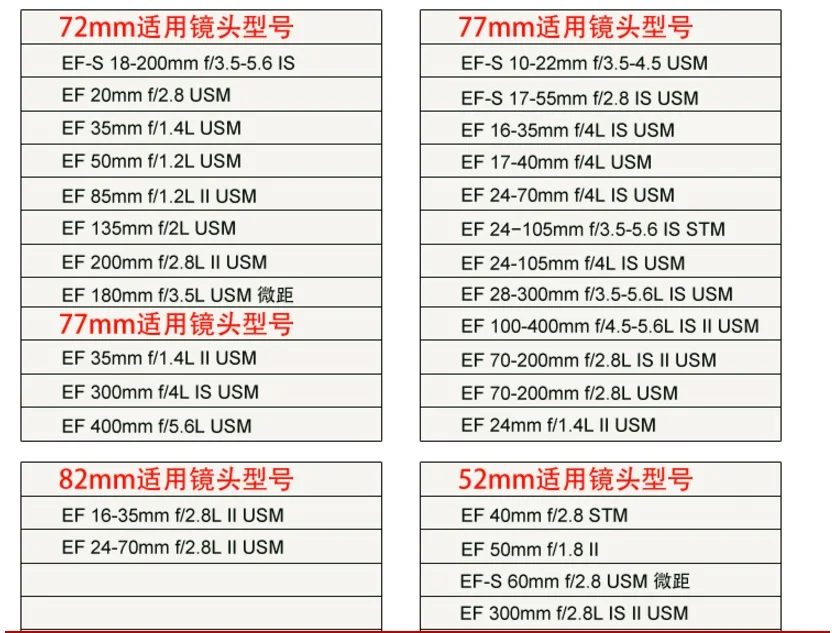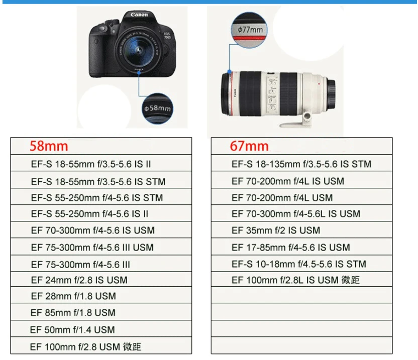 Любой объектив, фильтр, адаптер с 49 52 55 58 62 67 72 77 82 мм резьбой фильтра