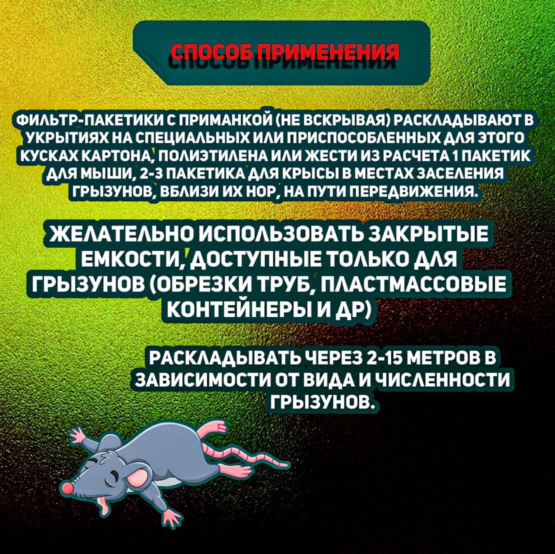 4. Расход приманки определяется в зависимости от численности грызунов. Информация размещена на упаковке.