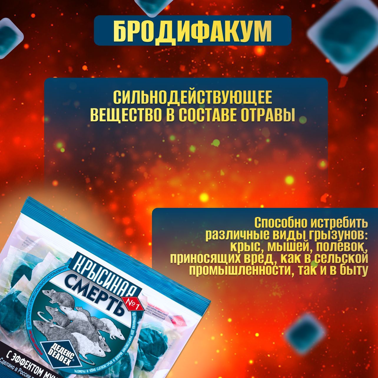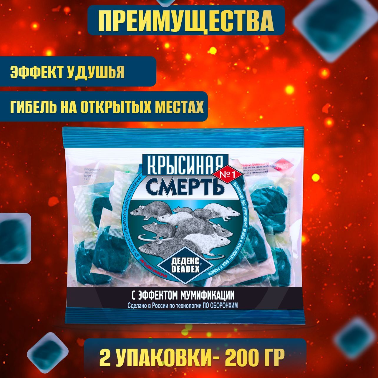 Описание: Вы хотите избавиться от грызунов на вашей даче или в доме? Устали от бесконечной борьбы с назойливыми крысами и мышами? Предлагаем вам средство, которое навсегда решит вашу проблему - Крысиная смерть, мумифицирующая отрава от мышей и крыс. Крысиная смерть - это уникальное химическое средство, разработанное специально для эффективной борьбы с грызунами. Оно обеспечивает надежную защиту от вредителей, не оставляя им ни единого шанса на выживание. Благодаря мощному действию препарата, мыши и крысы погибают в течение 2-4 суток после контакта с отравой. Одной из главных особенностей Крысиной смерти является ее универсальность. Она подходит для использования как на даче, так и в доме. Благодаря специальной форме и упаковке, вы можете расположить отраву в любом удобном для вас месте. Крысиная смерть доступна в виде брикетов , что позволяет выбрать наиболее удобной способ применения. Ультразвуковой отпугиватель справляется куда хуже обычной отравы от грызунов. Он излучает сильные ультразвуковые волны, которые отпугивают мышей и крыс, заставляя их покинуть ваш участок. А наши брикеты вызывают свертываемость крови у крыс и мышей, а также приступы удушья, что и делает мумификация. Важно отметить, что Крысиная смерть абсолютно безопасна для домашних животных, таких как кошки и собаки. Благодаря гуманному подходу к борьбе с вредителями, отрава не представляет опасности для домашних питомцев. Так как сильно зависит от размера вредителя. На маленькую мышку хватит 1-го брикета, на большую крысу 2-3, бывает и 4 пакета. Тогда как кошке и тем более собаке нужно намного больше, но следите, чтобы они их не кушали, берегите своих любимых питомцев. При наличии домашних питомцев, помещайте брикеты в труднодоступные места, контейнеры, коробочки. Крысиная смерть - это не просто отрава от мышей и крыс, это полноценное решение вашей проблемы. Она эффективно работает даже в самых сложных условиях, обеспечивая полное уничтожение грызунов и предотвращая их повторное появление. Не откладывайте решение проблемы на потом! Закажите Крысиную смерть прямо сейчас и наслаждайтесь своим домом или дачей без грызунов. Будьте уверены, что с нашим товаром вы навсегда избавитесь от назойливых грызунов!