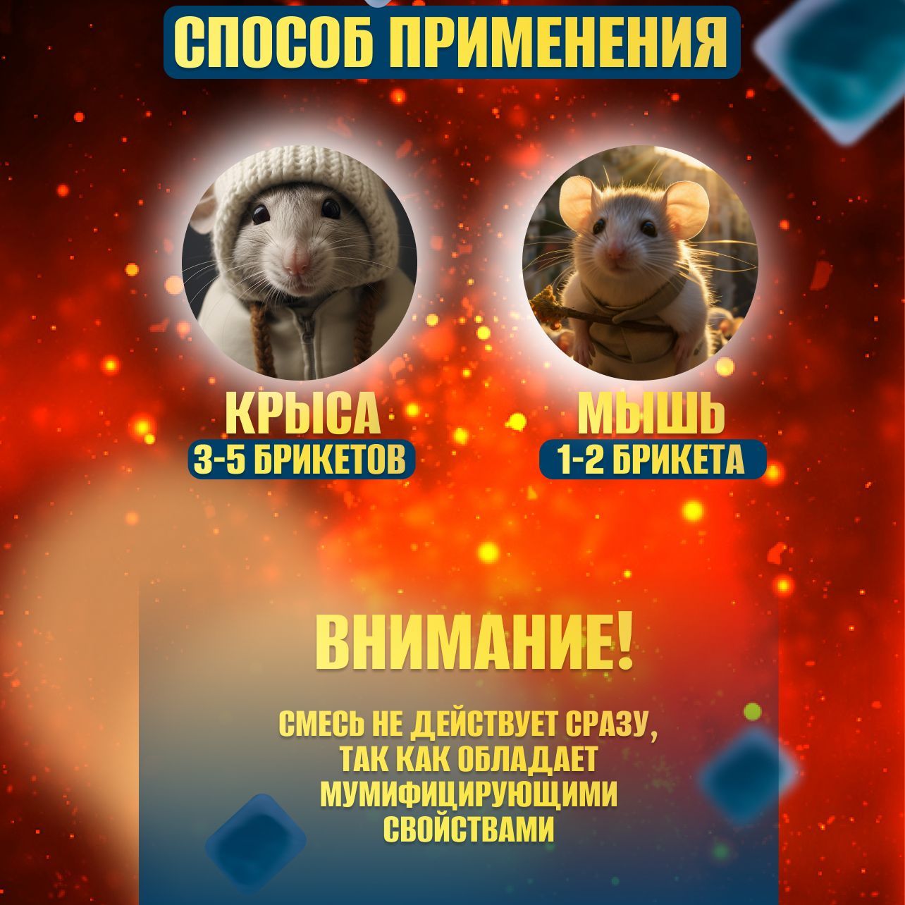 Описание: Вы хотите избавиться от грызунов на вашей даче или в доме? Устали от бесконечной борьбы с назойливыми крысами и мышами? Предлагаем вам средство, которое навсегда решит вашу проблему - Крысиная смерть, мумифицирующая отрава от мышей и крыс. Крысиная смерть - это уникальное химическое средство, разработанное специально для эффективной борьбы с грызунами. Оно обеспечивает надежную защиту от вредителей, не оставляя им ни единого шанса на выживание. Благодаря мощному действию препарата, мыши и крысы погибают в течение 2-4 суток после контакта с отравой. Одной из главных особенностей Крысиной смерти является ее универсальность. Она подходит для использования как на даче, так и в доме. Благодаря специальной форме и упаковке, вы можете расположить отраву в любом удобном для вас месте. Крысиная смерть доступна в виде брикетов , что позволяет выбрать наиболее удобной способ применения. Ультразвуковой отпугиватель справляется куда хуже обычной отравы от грызунов. Он излучает сильные ультразвуковые волны, которые отпугивают мышей и крыс, заставляя их покинуть ваш участок. А наши брикеты вызывают свертываемость крови у крыс и мышей, а также приступы удушья, что и делает мумификация. Важно отметить, что Крысиная смерть абсолютно безопасна для домашних животных, таких как кошки и собаки. Благодаря гуманному подходу к борьбе с вредителями, отрава не представляет опасности для домашних питомцев. Так как сильно зависит от размера вредителя. На маленькую мышку хватит 1-го брикета, на большую крысу 2-3, бывает и 4 пакета. Тогда как кошке и тем более собаке нужно намного больше, но следите, чтобы они их не кушали, берегите своих любимых питомцев. При наличии домашних питомцев, помещайте брикеты в труднодоступные места, контейнеры, коробочки. Крысиная смерть - это не просто отрава от мышей и крыс, это полноценное решение вашей проблемы. Она эффективно работает даже в самых сложных условиях, обеспечивая полное уничтожение грызунов и предотвращая их повторное появление. Не откладывайте решение проблемы на потом! Закажите Крысиную смерть прямо сейчас и наслаждайтесь своим домом или дачей без грызунов. Будьте уверены, что с нашим товаром вы навсегда избавитесь от назойливых грызунов!