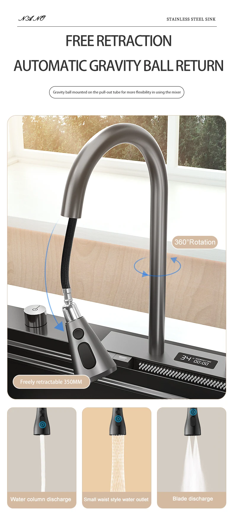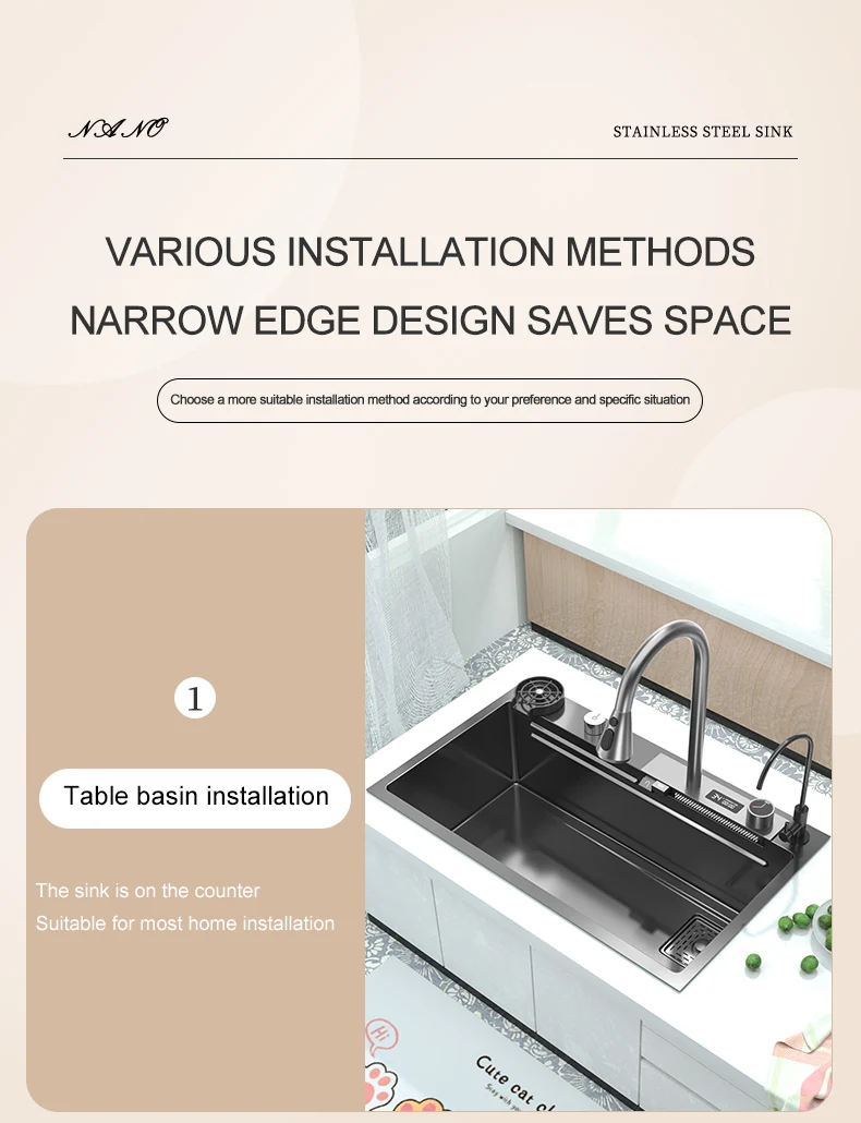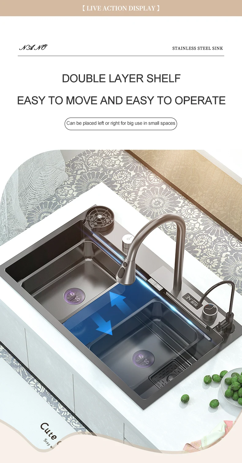 Кухонная раковина «Водопад» из нержавеющей стали 304, большая раковина с одним слотом и многофункциональным сенсорным смесителем «Водопад», над счетчиком