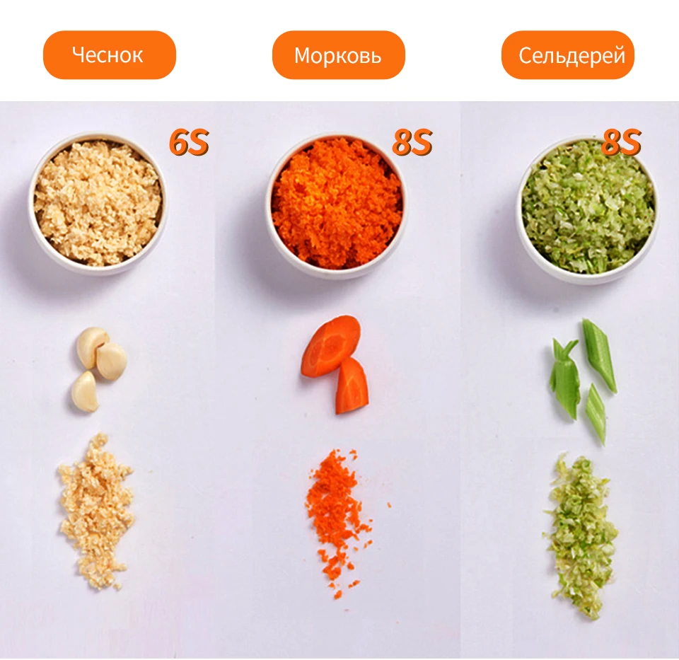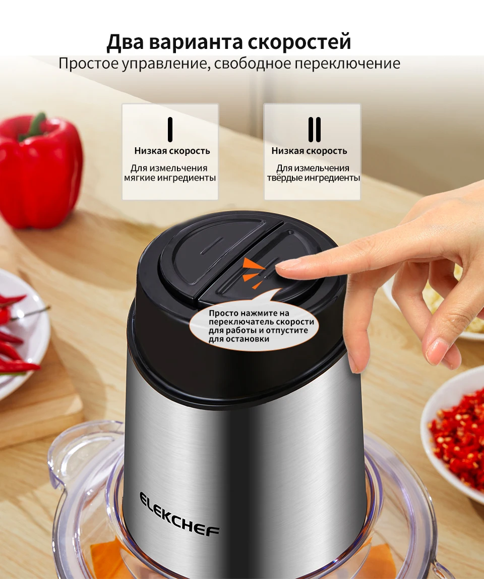 С высокой и низкой скоростью управления, Электрический измельчитель позволяет свободно выбирать точный контроль, чтобы производить идеальную текстуру ваших ингредиентов. Высокая скорость хороша для мяса, орехов, моркови, тыквы; Медленная скорость применяется для яиц, овощей, фруктов и т. д. Выберите правильную рабочую скорость, чтобы служить вам.