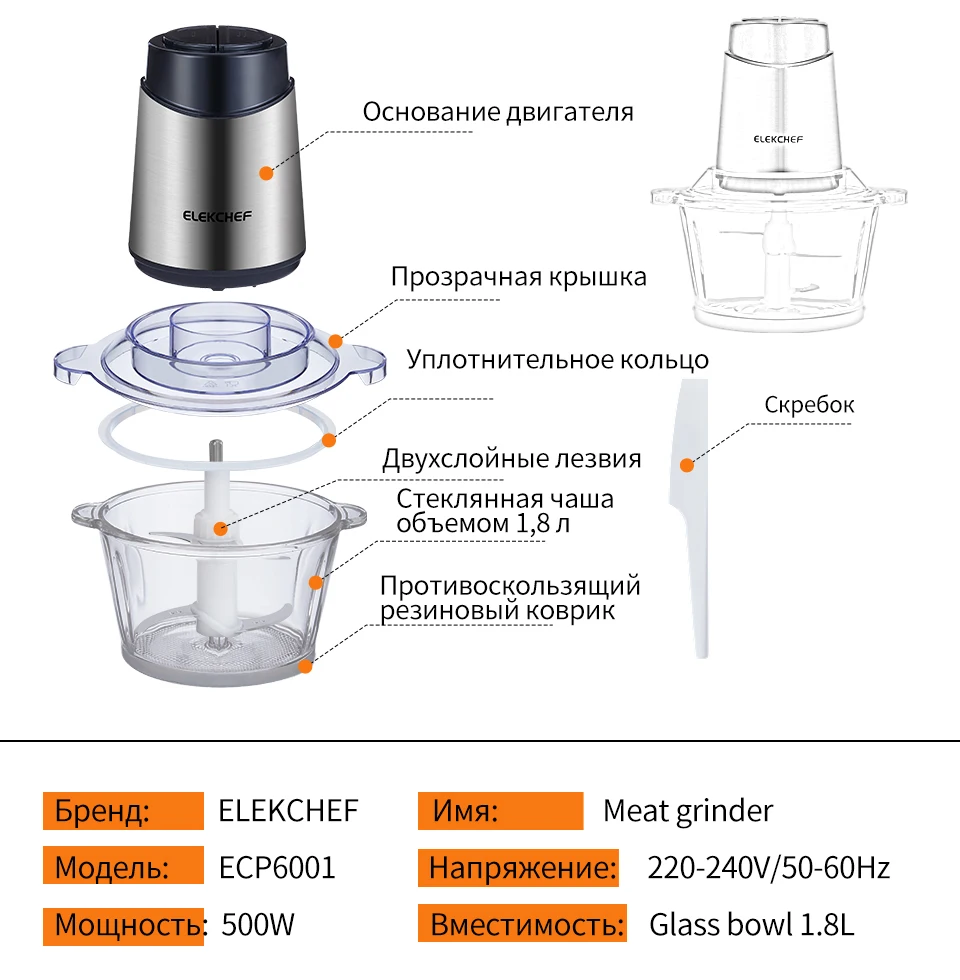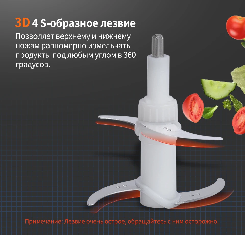 Этот Электрический измельчитель для пищевых продуктов оснащен электродвигателем из чистой меди мощностью 500 Вт и 4 острыми лезвиями из нержавеющей стали, что позволяет быстро нарезать, смешивать, смешивать и измельчать различные ингредиенты.