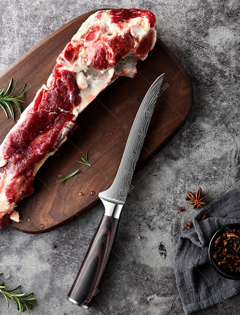 2-Материал лезвия-нержавеющая сталь, легкий и Острый как бритва, держите кухню подальше от тупого ножа и наслаждайтесь кухонной жизнью. Поверхность лазерного Дамасского узора, такая красивая и высококачественная, хорошее качество изготовления. Материал ручки-цветное дерево, перерабатываемый материал, экологически чистый.