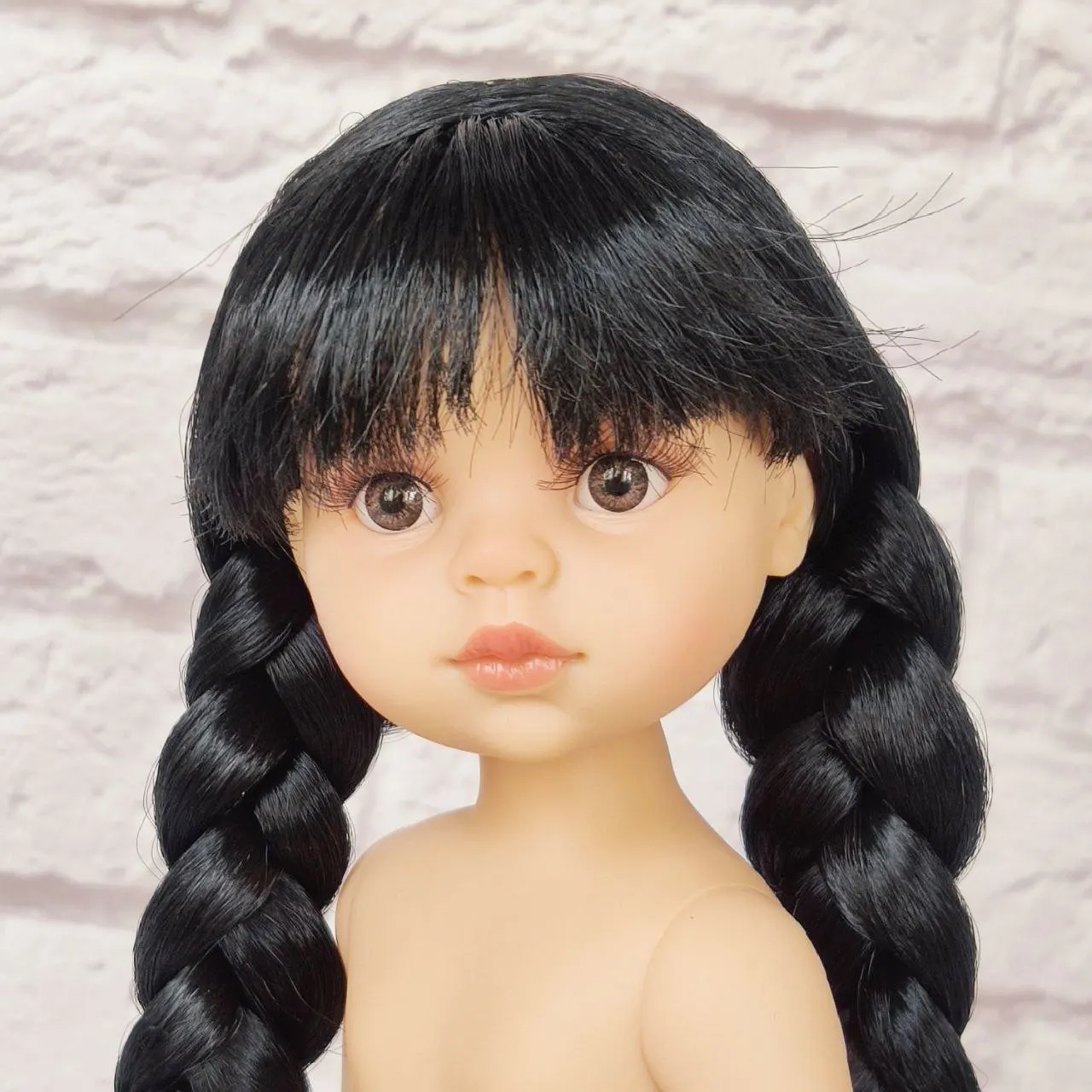 Paola Reina Карина арт 14834 , черные волосы, собранные в две косы, челка, карие глаза. Косы можно расплести - прошивка по всей голове.