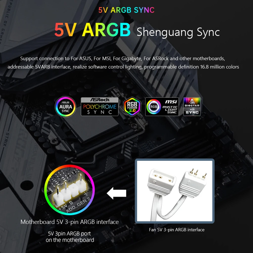 3. 5 В ARGB, синхронизация ауры:Он поддерживает подключение адресуемых интерфейсов ARGB 5 В для ASUS / MSI / Gigabyte / ASRock и других материнских плат для обеспечения программного управления освещением, а 16,8 миллиона цветов могут быть определены программно. Поддержка интеллектуального контроля температуры с ШИМ материнской платы, автоматическая регулировка скорости вентилятора в соответствии с температурой процессора, экономия энергии и снижение шума, а также бесшумное удовольствие.