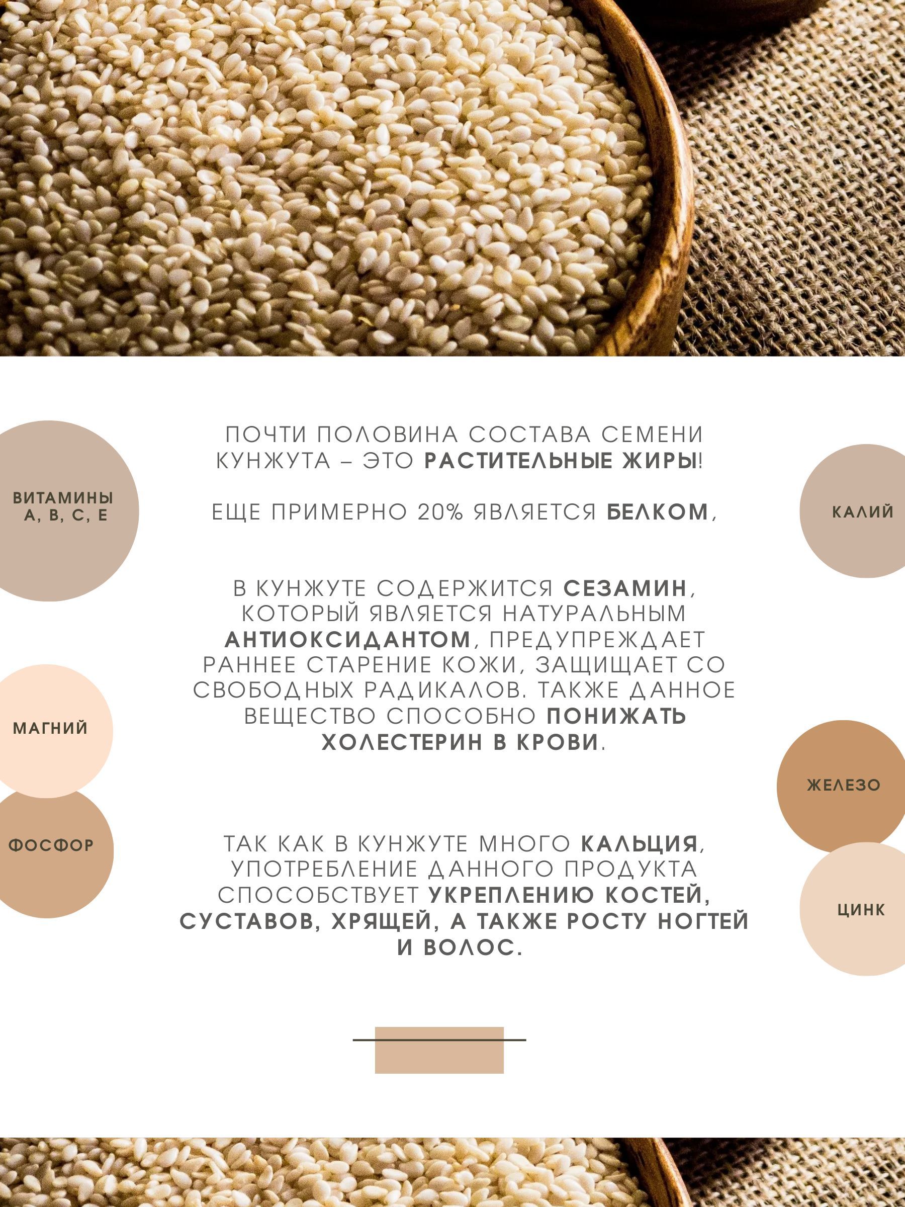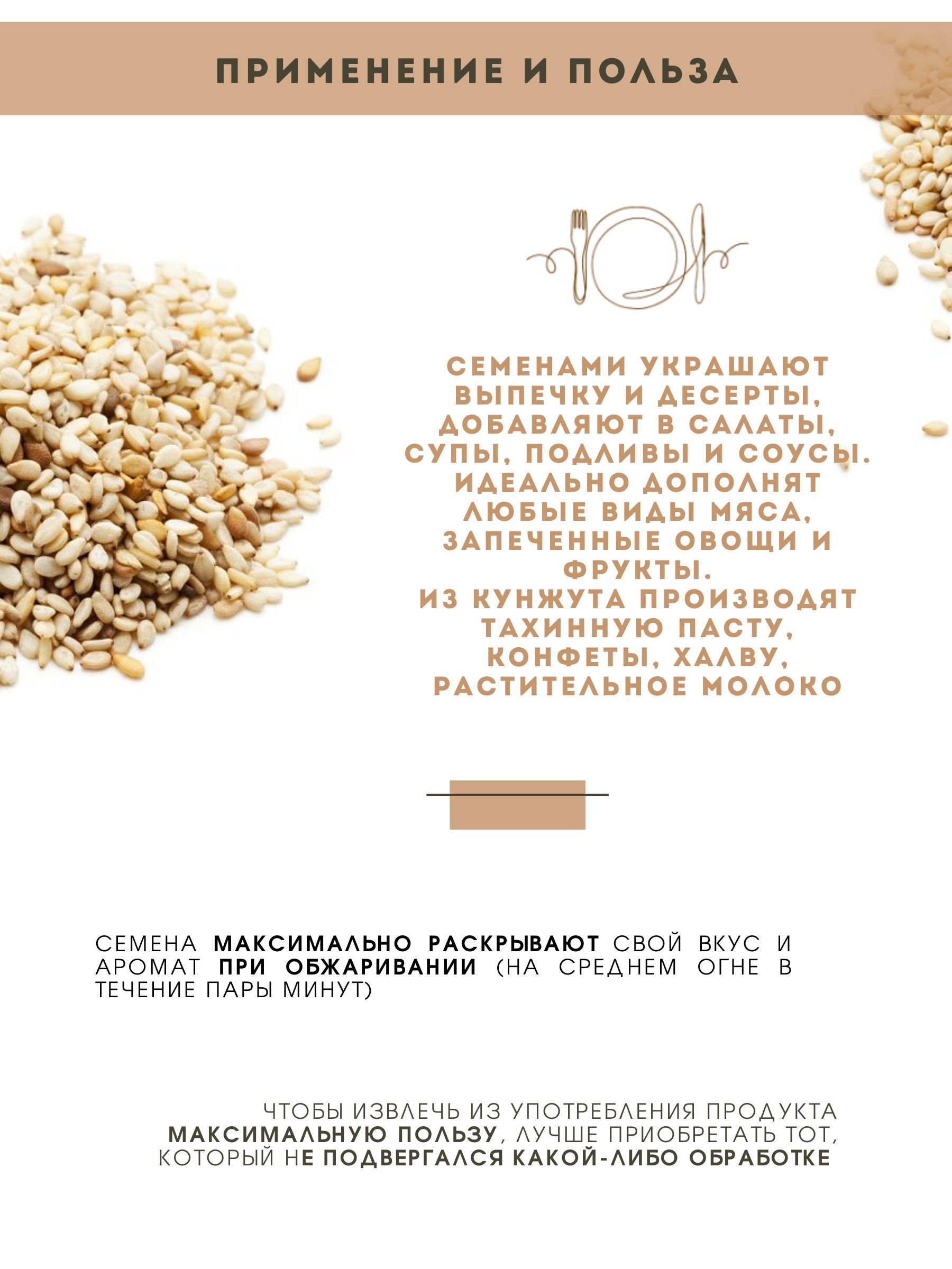 Описание: Натуральный Белый Кунжут является одной из самых полезных древних специй. Кунжут - однолетнее растение семейства Сезамовых (кунжутных). Это древнейшая культура, научное название которой Sesamum indicum. Выращивают его в основном из-за его маслянистых семян, которые играют важную роль в питании человека. Большей популярностью пользуется белый кунжут. Это семена, очищенные от внешней оболочки, обработанные и подвергшиеся шлифовке. Кунжут белый имеет нейтральный, богатый ореховый вкус и мягкий, слегка сладковатый ореховый аромат. Универсальный Суперфуд кунжут белый может использоваться не только как самостоятельный продукт, но и в составе смеси семян для овощных или фруктовых салатов, для приготовления любых первых и вторых блюд, для сладостей или кунжутного молока, кунжутом посыпают сладости, хлеб, печенье, десерты, выпечку. Из кунжута делают разнообразные кулинарные шедевры: кунжутное масло, кунжутная паста, кунжутная паста урбеч, кунжутный соус. В Корейской и Китайской кухне часто готовят мясо и курицу с семенами кунжута или в кунжутном масле, поскольку оно выводит вредные вещества из организма. Иногда семена кунжута обжаривают для усиления вкуса. Кунжут станет вкусным и питательным дополнением к любому завтраку. Его можно добавить к йогурту, мюсли или любым кашам, выпечке. Семена белого кунжута богаты полезными веществами такими как: кальций, органическими жирными кислотами, фосфор, железо, пищевые волокна, фитин, магний, различными витаминами группы: А, В, Е, С, РР.