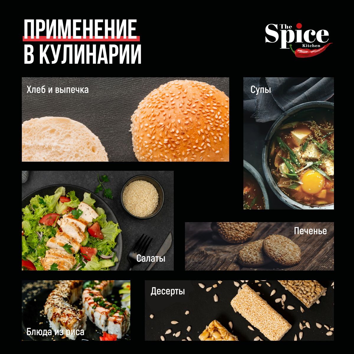 Семена кунжута в кулинарии используют для приготовления казинаков, конфет, халвы и прочих сладостей, в хлебобулочных изделиях и как приправу к мясу. Кунжутные семена относят к масленичным продуктам. В них содержится почти 60% объема семени растительных жиров, среди которых линолевая, олеиновая, пальмитиновая, миристиновая, арахиновая, стеариновая и лигноцериновая кислоты. Эти вещества являются незаменимыми для организма человека и принимают участие во всех жизненно важных процессах. Также семена кунжута имеют богатый витаминно-минеральный состав: