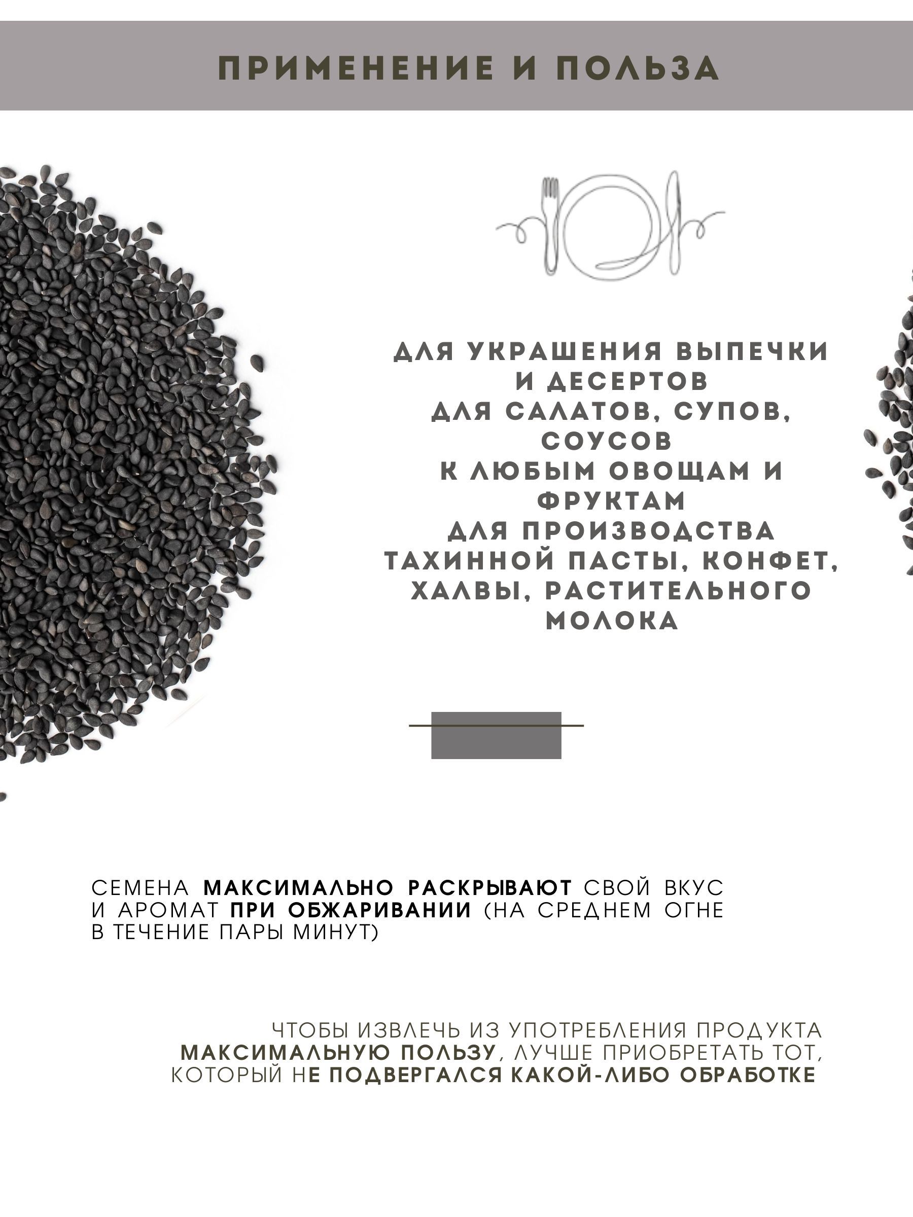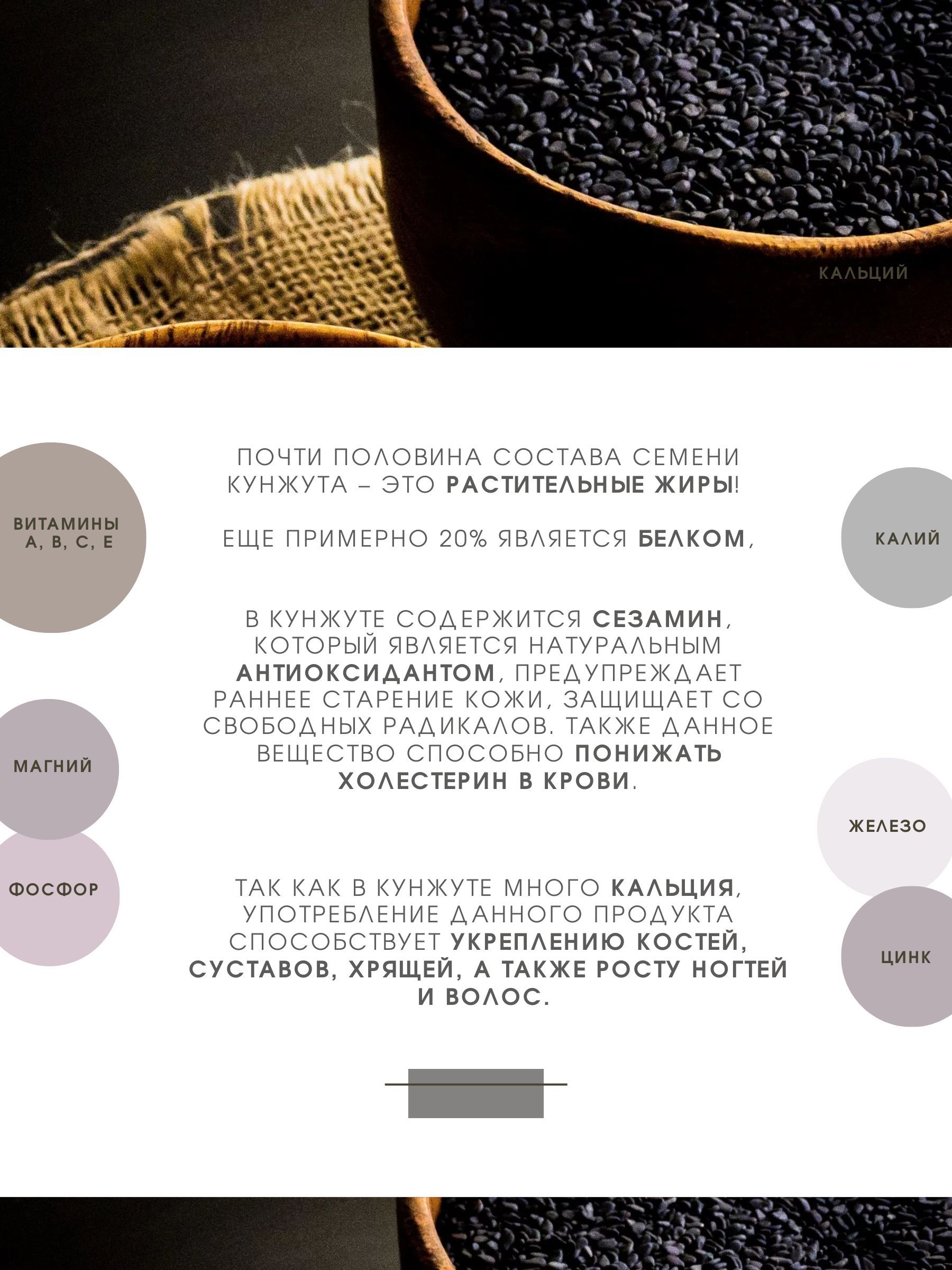 Описание: Натуральный Кунжут является одной из самых полезных древних специй. Кунжут черный - это неочищенные семена растения сезама. Cемена имеют маленький размер, отличаются от белых большей питательностью. Универсальный Суперфуд кунжут черный может использоваться не только как самостоятельный продукт, но и в составе смеси семян для овощных или фруктовых салатов, для приготовления любых первых и вторых блюд, для сладостей или кунжутного молока, кунжутом посыпают сладости, хлеб, печенье, десерты, выпечку. Из кунжута делают разнообразные кулинарные шедевры: кунжутное масло, кунжутная паста, кунжутная паста урбеч, кунжутный соус. В Корейской и Китайской кухне часто готовят мясо и курицу с семенами кунжута или в кунжутном масле, поскольку оно выводит вредные вещества из организма. Кунжут станет вкусным и питательным дополнением к любому завтраку. Его можно добавить к йогурту, мюсли или любым кашам, выпечке. Черный цвет говорит о выраженных антиоксидантных качествах. Кунжутные семена полезны для пищеварительной системы и жизнедеятельности полезной микрофлоры кишечника. Кунжут полезен еще и тем, что содержит много кальция. Он стоит на первом месте среди растительных источников по количеству кальция и поскольку семена кунжута наполовину состоят из масла, они также являются отличным источником здоровых мононенасыщенных и полиненасыщенных жиров.