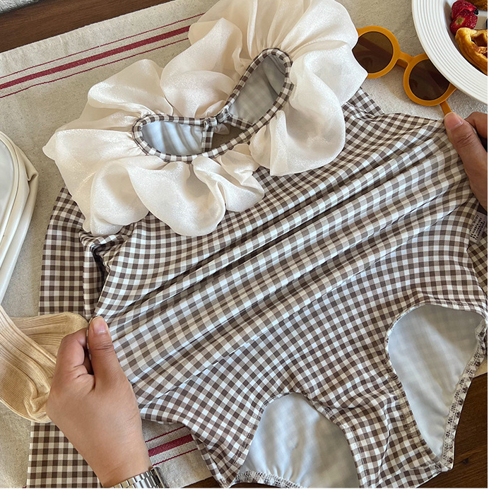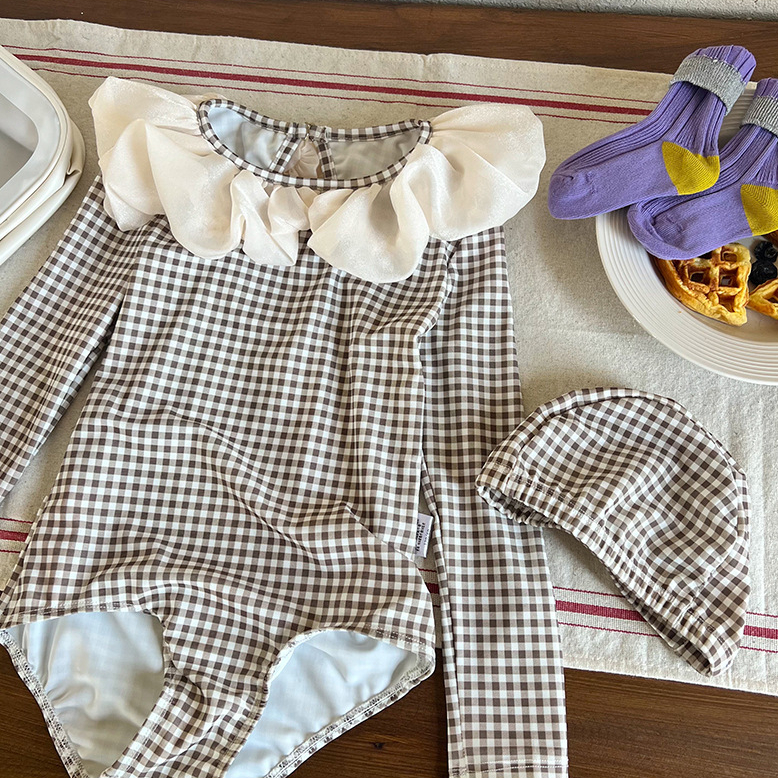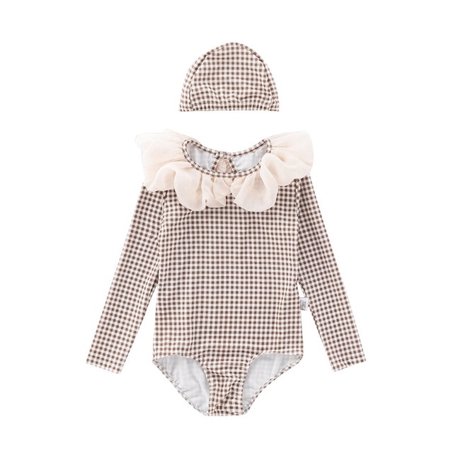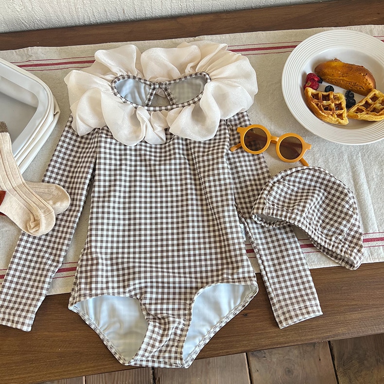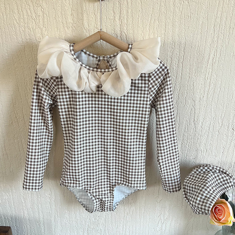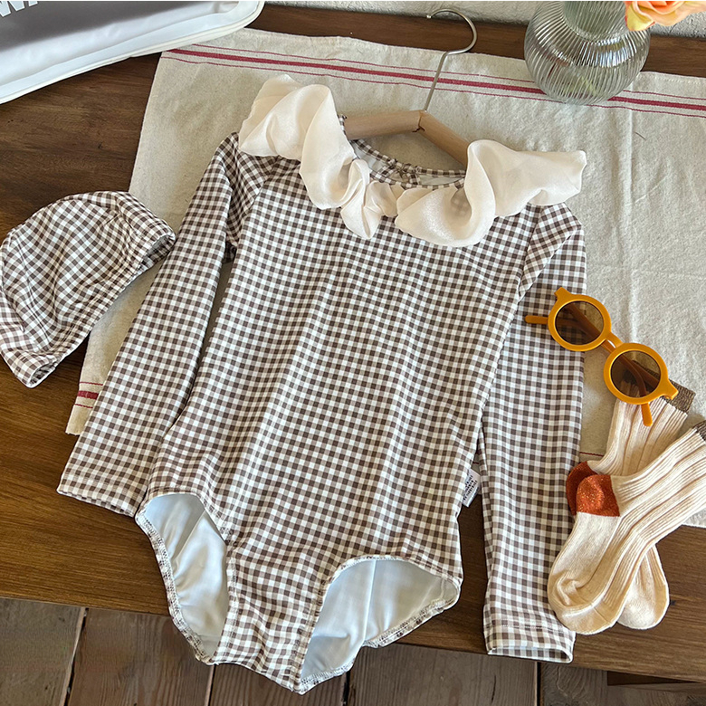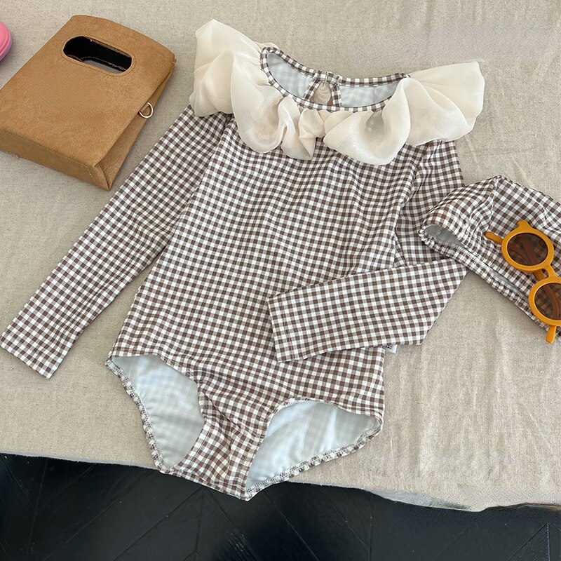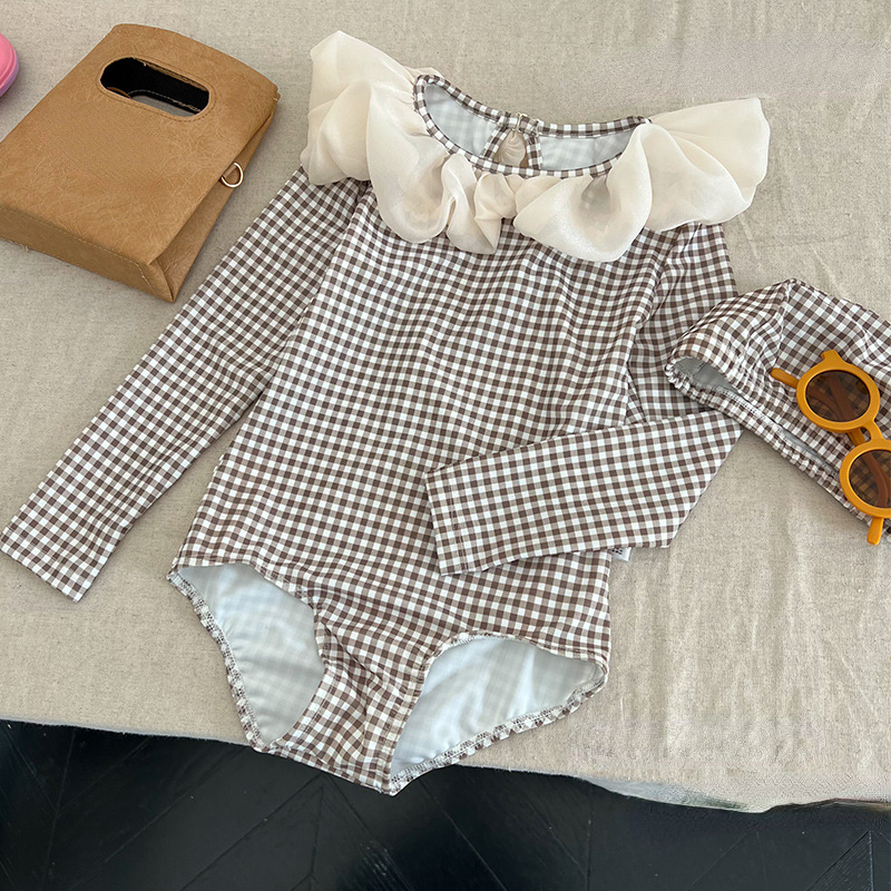 Купальник для девочек, Цельный купальник, женская одежда для плавания, купальник в клетку с длинным рукавом для детей, летние купальные костюмы