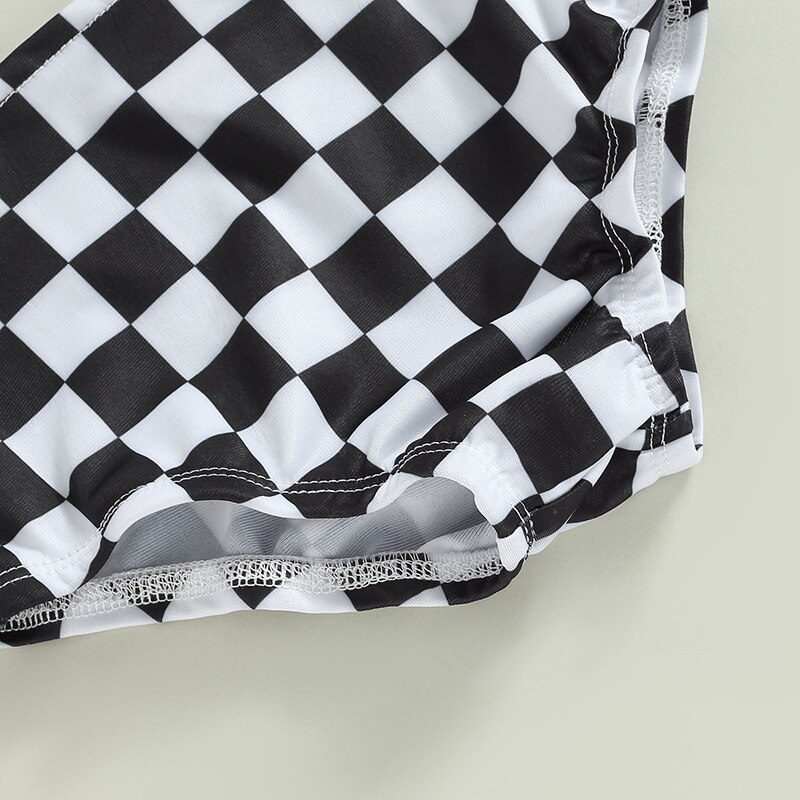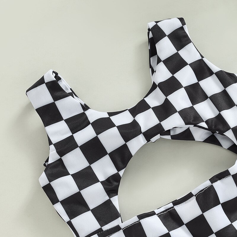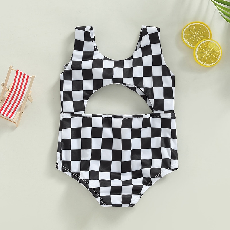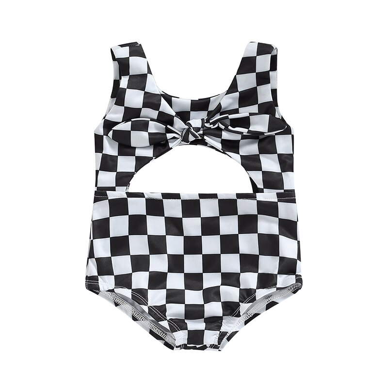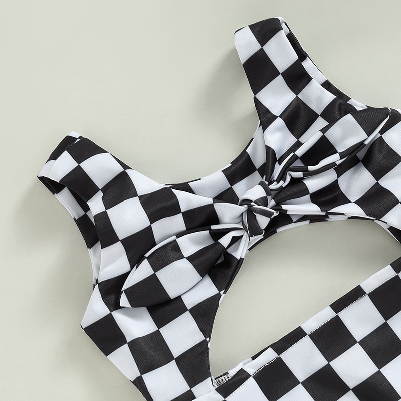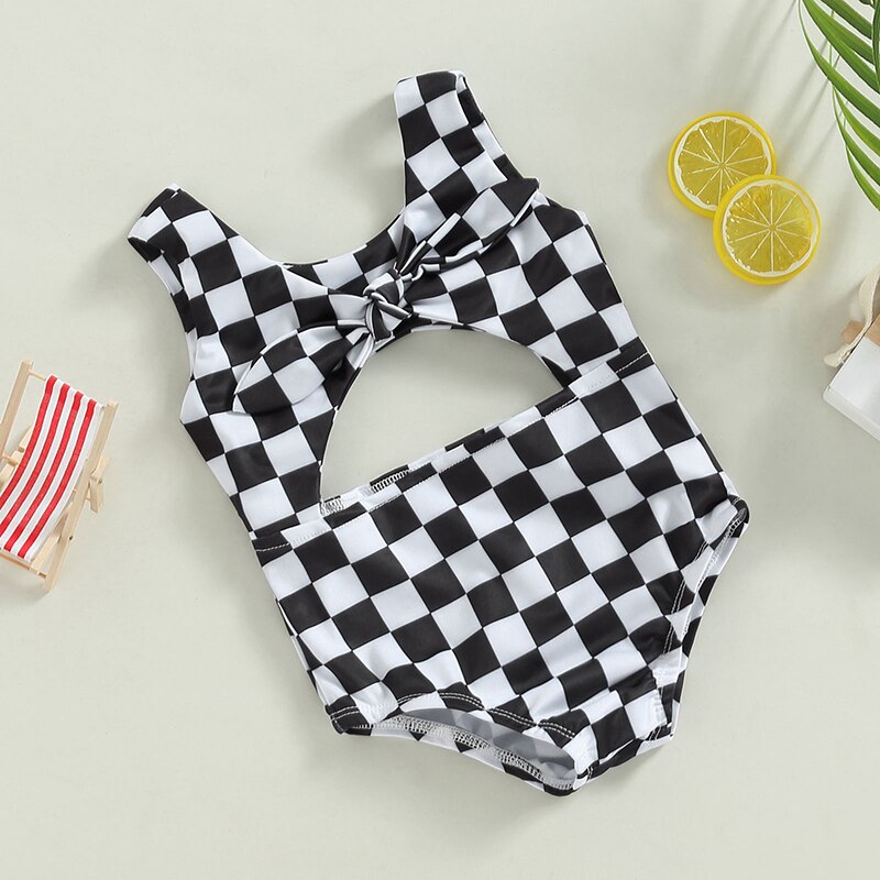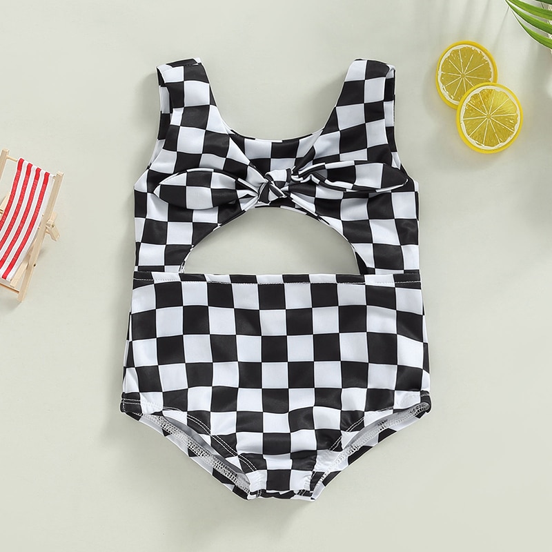 Купальники для маленьких девочек без рукавов с круглым вырезом в клетку с полым бантом Летний купальник для плавания