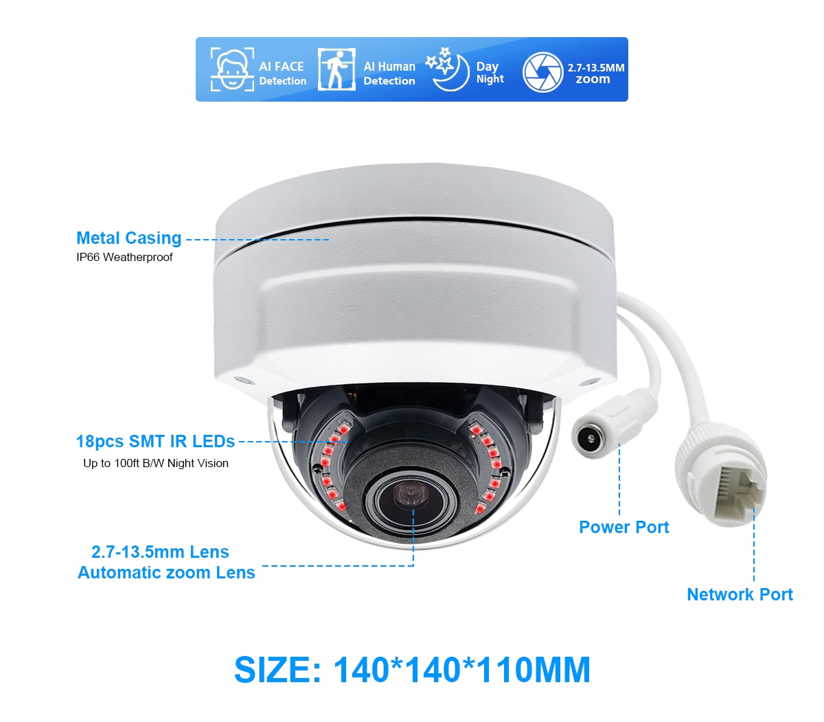 48V POE AI камера (POE камера):802.3af стандартный PoE модуль Встроенный, он может работать с 48V PoE инжектор или 48V POE NVR, стандарт 802.3af