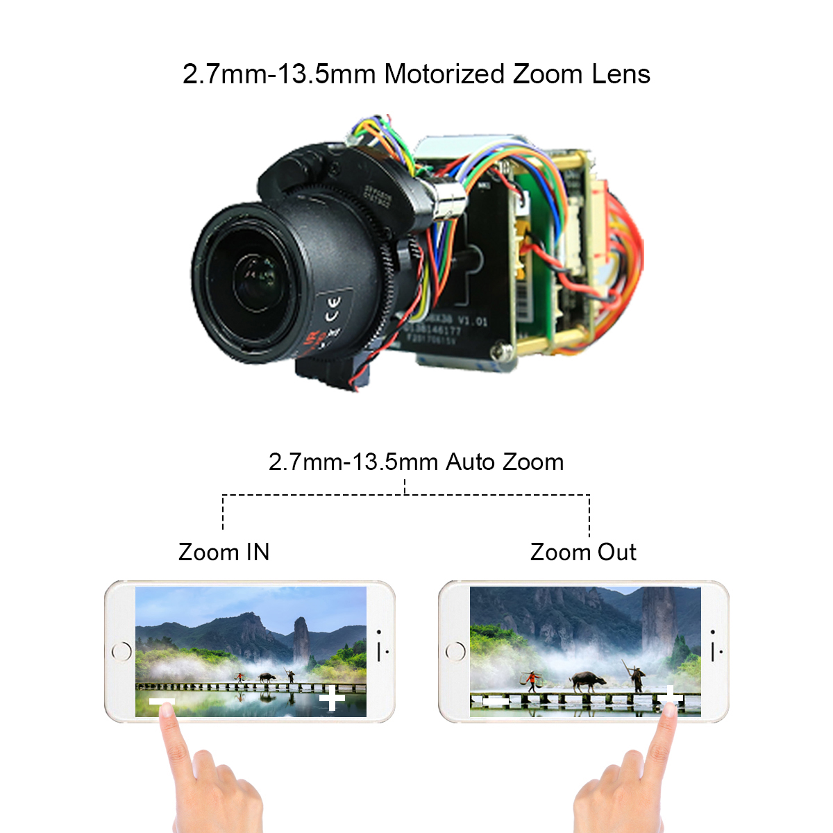 2,7-13,5 мм объектив 5X оптический зум-камера вы можете просмотреть четкое изображение издалека, также вы можете увеличить, чтобы увидеть более подробную информацию о дальних предметах, или Уменьшите масштаб, чтобы получить более широкий и большой вид