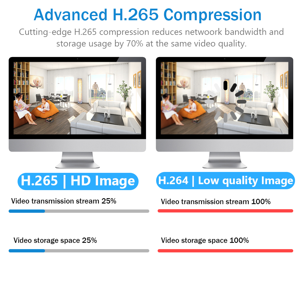 Благодаря усовершенствованному алгоритму управления скоростью, адаптивному к сцене, интеллектуальная технология кодирования обеспечивает более высокую эффективность кодирования, чем H.265