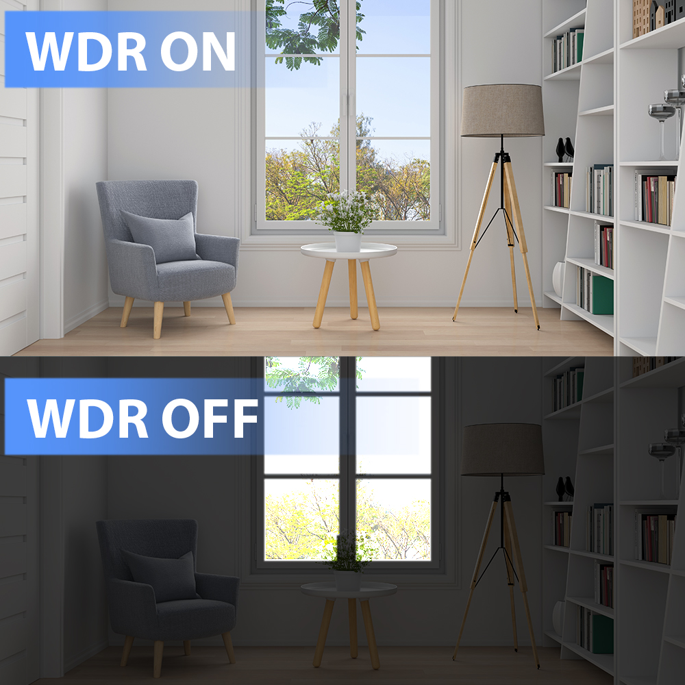 В условиях с очень светлыми и темными участками, например, у входной двери в офисном здании или у входа в крытый гараж или туннель, камера может снимать изображения с чрезмерной экспонировкой в ярких областях и с недостаточной экспонировкой в темных областях, что значительно влияет на качество изображения. Камера с WDR может помочь решить эту проблему. Комбинируя изображения с короткой и длинной экспозицией в одно изображение, технология WDR четко фиксирует как яркие, так и темные области.