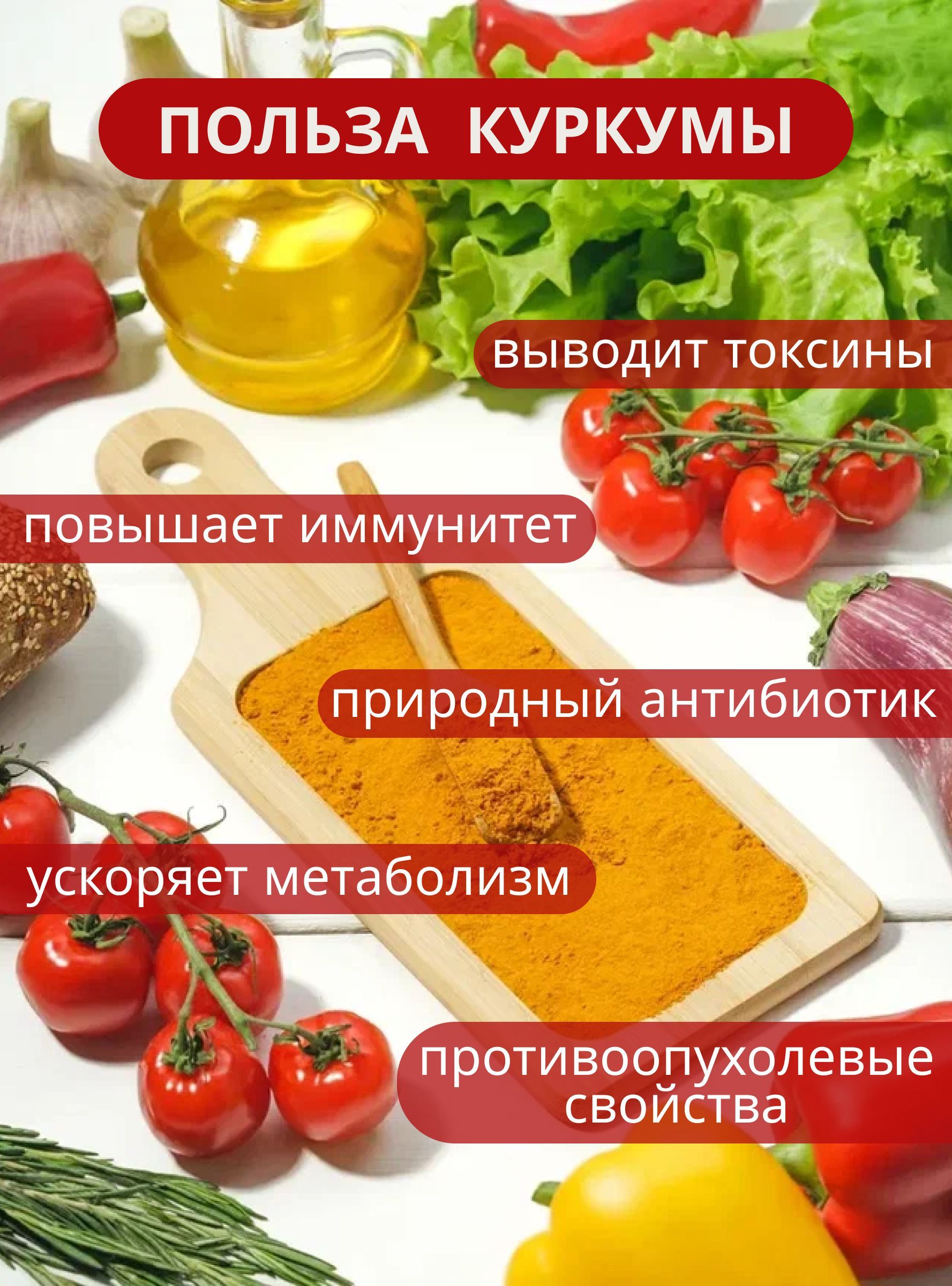 Описание: Куркума - уникальная специя, которую используют не только для придания необычайного аромата и вкуса блюдам, но также яркого золотистого цвета и полезных элементов.