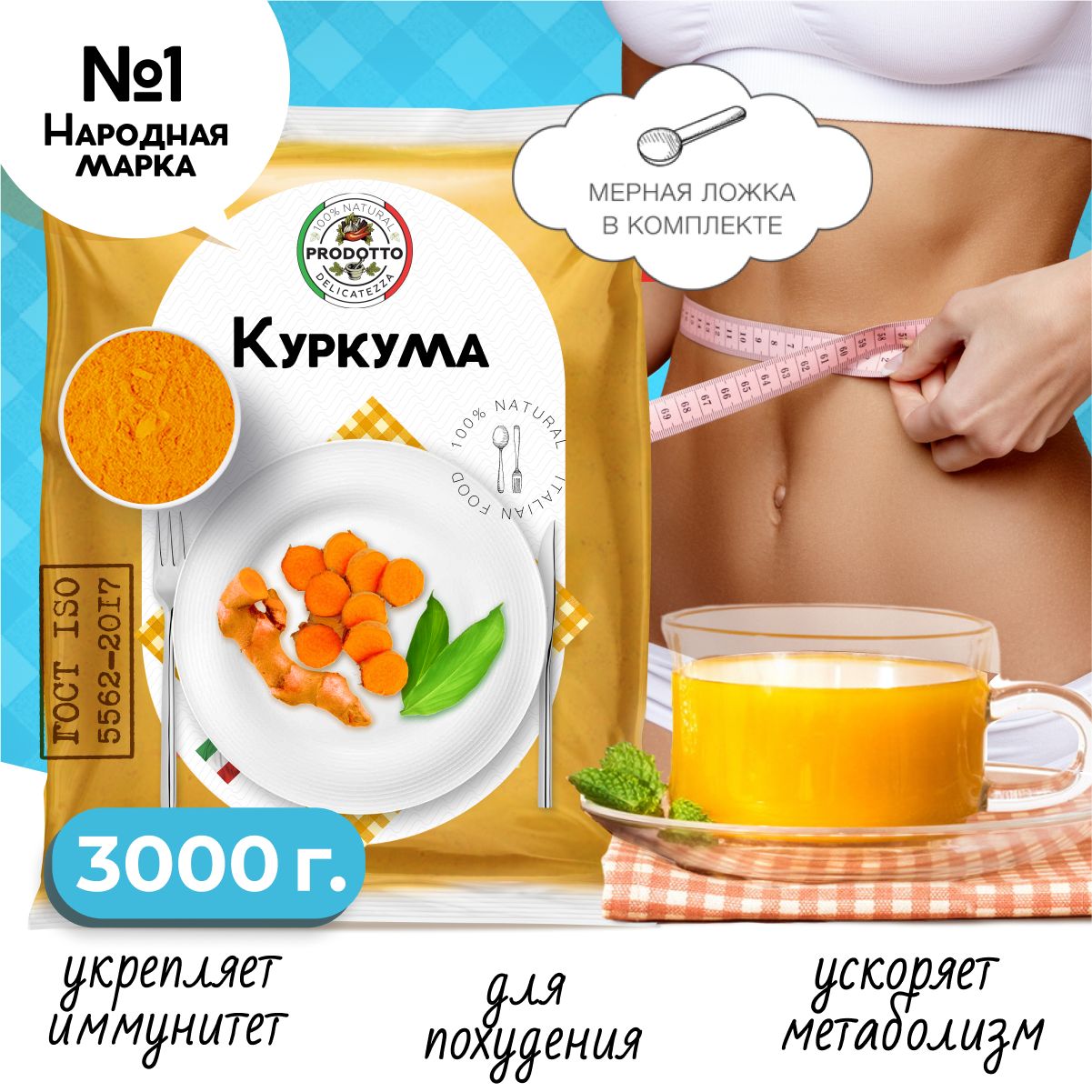 Описание: Куркума - солнечная пряность, которая повысит иммунитет и усилит яркость ваших блюд. Наша куркума изготовлена по ГОСТу без красителей, примесей и усилителей вкуса. Куркумин - антиоксидант с богатым витаминно-минеральным составом. Добавлять в пищу надо небольшие порции приправы, чтобы насытить вкус и цвет продукта. Простые блюда в дуэте с куркумой получаются вкусными. Например: рис, картофель, рыба, мясо, сыры, овощи, крупы, фрукты, ягоды, макаронные изделия. Добавляют в чай, выпечку, супы, салаты. Мелкий помол без комочков и посторонних примесей имеет рассыпчатую текстуру и равномерный оранжево-желтый оттенок. Аромат схож с миксом запаха имбиря и апельсина, имеет свежий пряно-древесный подтон.
