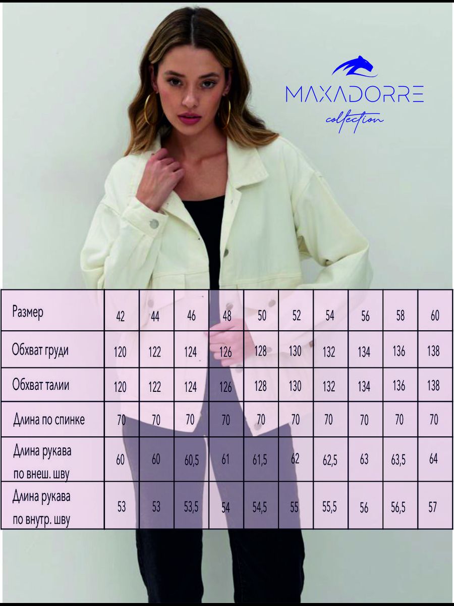 Описание: Джинсовая женская куртка MAXADORRE на пуговицах - трендовая верхняя одежда сезона весна осень лето 2023. Свободная летняя джинсовка выполнена из натурального хлопка подойдёт всем, кто любит комфорт, практичность и стиль. Короткая джинсовка оверсайз кроя одевается поверх любого комплекта и создает законченный образ. Весенняя модная курточка защитит тебя от вечерней прохлады. Весной и летом длинная куртка ветровка из денима идеальна для воплощения образа в стиле casual, офис, а также в более элегантном и женственном стиле. Джинсовая плотная спортивная рубашка oversize на весну отлично сочетается с джинсами, брюками, шортами, сарафанами, платьями и легкими юбками. Молодежная джинсовка отлично подходит для девочки подростка и высоких, и невысоких девушек. Джинсовые куртки также стильно смотрятся и подходят для беременных женщин. Куртку большого размера оценят девушки, которые любят стильный оверсайз. Рост девушки на фото 175см, размер 42, размер изделия 42. Длина по спинке 70 см, обхват груди 120 см, длина по внешнему шву 60 см, по внутреннему 53 см.