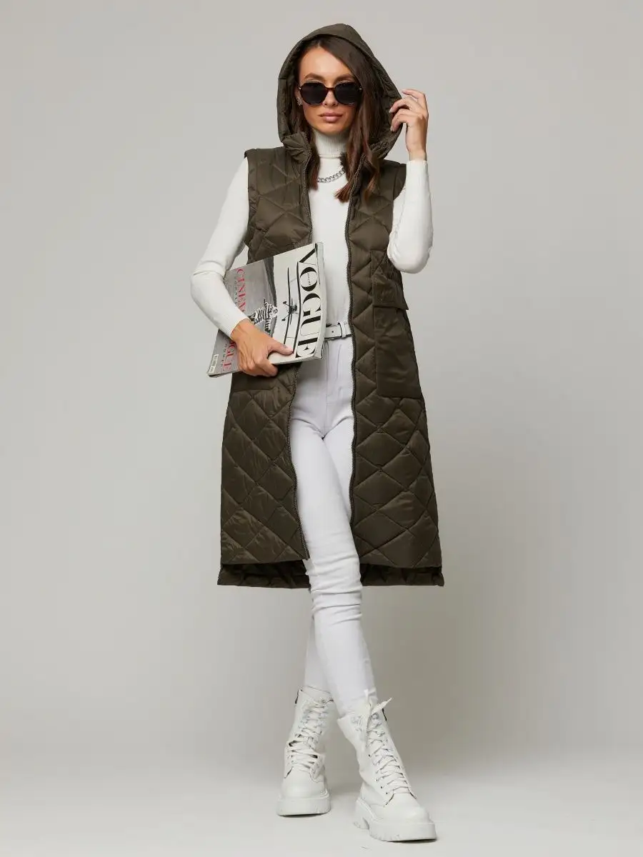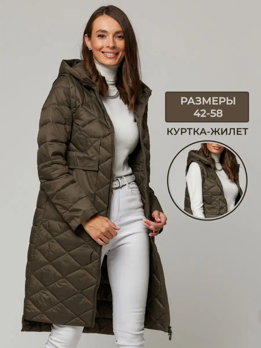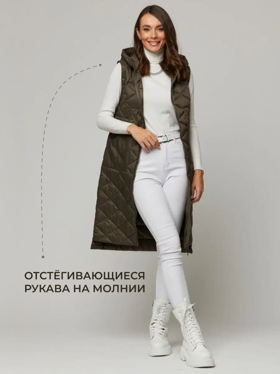 Описание: Стеганая куртка женская прямого кроя с отстегивающимися рукавами от Ariana Fashion - это модная женская одежда, которая трансформируется в жилет с помощью молнии на рукавах. Куртка демисезонная женская удлиненная до колена из стеганой ткани с воротником стойкой, переходящим в капюшон. Куртка женская весна с капюшоном удлиненная имеет молнию спереди и накладные карманы по бокам. Наполнитель куртки женской осенней удлиненной био-пух обладает несравненной лёгкостью и теплом. Верхний материал имеет влаго- и ветрозащиту. УВАЖАЕМЫЕ ПОКУПАТЕЛИ, ОБРАТИТЕ ВНИМАНИЕ, ЧТО РАЗМЕРЫ 52-58 МАЛОМЕРЯТ НА 2 РАЗМЕРА. РАЗМЕР НА ИЗДЕЛИИ 6XL БУДЕТ СООТВЕТСТВОВАТЬ 54 РОССИЙСКОМУ РАЗМЕРУ. В БОЛЬШИХ РАЗМЕРАХ БЕЖЕВОГО ЦВЕТА 2XL (50) - 6XL (58) МЫ ИЗМЕНИЛИ ФУРНИТУРУ И ДОБАВИЛИ ШНУРОК-УТЯЖКУ, ФОТО ДОБАВЛЕНО В КАРТОЧКУ. Куртка женская весна 2023 имеет большие размеры и подойдет как стильная верхняя одежда для полных женщин. Куртку удлиненную женскую весна можно носить весной как куртка женская весна удлиненная с капюшоном, в межсезонье как куртка демисезонная женская удлиненная или как куртка женская весна с капюшоном демисезонная, зимой и осенью как куртка удлиненная женская осень и куртка утепленная женская. Комфортная температура для носки куртки длинной женской весна от 0 до 15 градусов. Жилет удобно брать с собой в дорогу или использовать в качестве дополнительного греющего слоя под пальто. Также вы можете носить жилетку самостоятельно сочетая его с разными стильными образами: с худи, спортивным костюмом или длинным трикотажным платьем. Легкая куртка женская отлично подойдет девочкам подросткам как куртка молодежная демисезонная и подростковая куртка, а также девушкам и женщинам как трендовая куртка или куртка женская осень длинная. Куртка женская стеганая весна с капюшоном станет незаменимой вещью в гардеробе. Куртка представлена в нескольких цветах как бежевая куртка, черная куртка, серая куртка и куртка хаки женская. Одежда больших размеров куртка весенняя женская больших размеров, куртки женские демисезонные большие размеры одежда для беременных и кормящих куртка женская осенняя больших размеров курточка женская безрукавка женская жилет женские куртки и жилеты куртка удлиненная стеганная куртка жилетка, куртка женская весна с капюшоном демисезонная, жилетка женская удлиненная