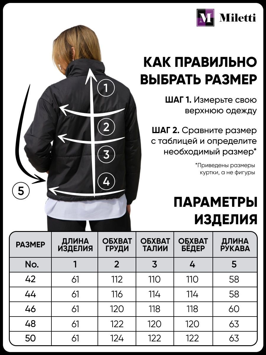 Описание: Куртка демисезонная короткая из новой коллекции осень-зима прекрасно впишется в женский гардероб. Куртка весенняя на молнии свободного кроя содержит утеплитель синтепон. Курточка женская на весну и демисезон - одежда, необходимая каждой моднице - это одна из топовых вещей весна - осень 2023 это очень сексуальной модель одежды, выгодно подчеркивающей линию ног и бедер. Поэтому мы предлагаем вам на выбор разные трендовые расцветки. Универсальные цвета - подходящие именно под Ваш цветотип. Демисезонная стеганая куртка рассчитана на температуру от 0 до +15 градусов. Ультралегкая, компактная, но при этом теплая курточка, которую удобно брать в дорогу, в путешествие. Она выполнена из водоотталкивающего материала, непромокаемая и непродуваемая. Укороченная модель подойдет на весну, осень и теплую зиму. Молодежная практичная, модная и стильная она надежно защищает от ветра и дождя, ее носят до поздней осени и надевают ранней весной. Стильный пуховик отлично подходит для еврозимы и холодной весны. Универсальная базовая модель с карманами смотрится великолепно с брюками, джинсами и с юбкой. Тонкий демисезонный бомбер будет одновременно тёплым и лёгким, что очень важно для ощущения комфорта. Укороченная модель - прекрасный выбор для автоледи. Свободный крой не сковывает движения, а наличие больших размеров по радует полных и беременных женщин. Куртка оверсайз - модная и комфортная, имеет снизу резинку, которую можно отрегулировать, согласно Вашему предпочтению. Зимняя модель имеет высокий воротник стойку и низ рукава на резинке, которые надежно защитят в непогоду. Преимуществом верхней одежды бренда Мiletti является ее легкость и практичность, подойдёт для бега, туризма, для прогулок с детьми и активного образа жизни. Куртка осенняя станет отличным подарком для женщины, девушки, девочки и подростков. Вы можете надеть ее в офис, на работу, на свидание, на прогулку, на деловую встречу, на природу, она прекрасно подойдет для похода на учебу в университет и школу. Стирать верхнюю одежду мы рекомендуем без отжима и при температуре не более 30 градусов.