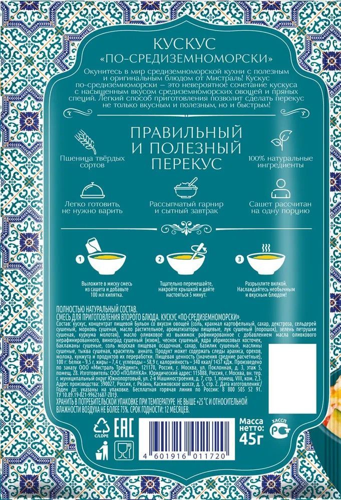 Кускус по-средиземноморски с овощами Мистраль, 45 г * 12 штук