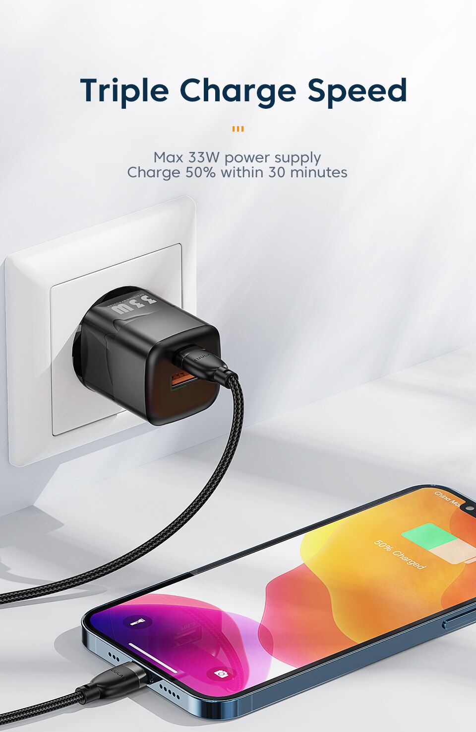 На 50% меньше обычного зарядного устройства на 18 Вт Удобнее носить с собой Тройная скорость зарядки