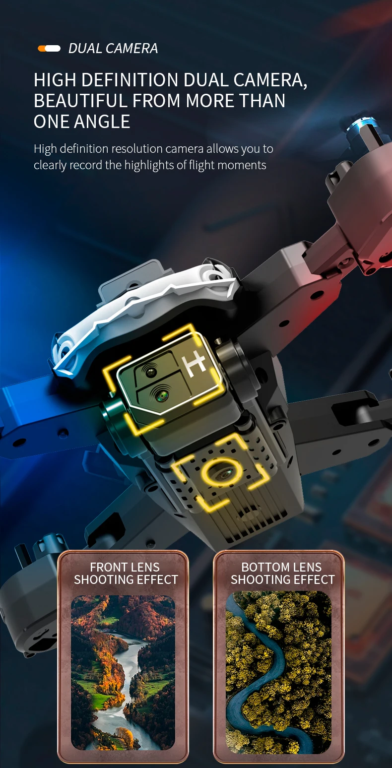 1. Передний объектив размещен с широкоугольным Wi-Fi высокой четкости 8K, нижний объектив высокой четкости с оптическим потоком может переключать угол камеры, наклон сервопривода панорамирования предназначен для повышения стабильности, и добавлена электронная защита от сотрясения EIS, чтобы сделать линию фото более четкой