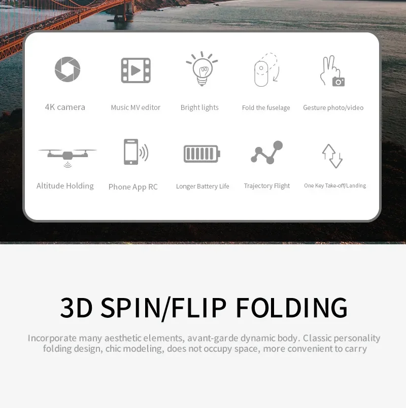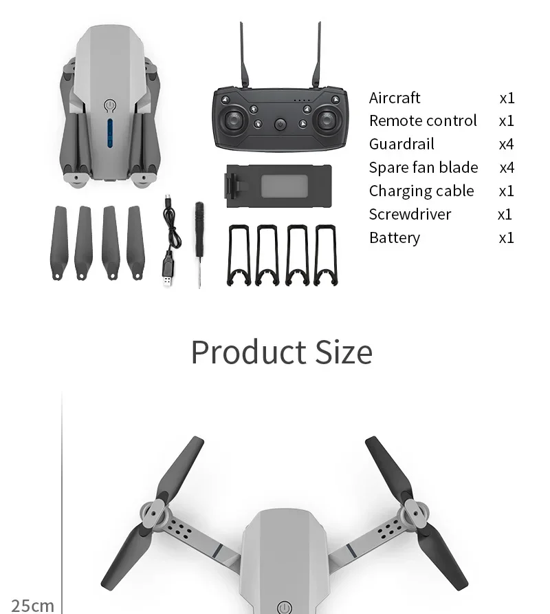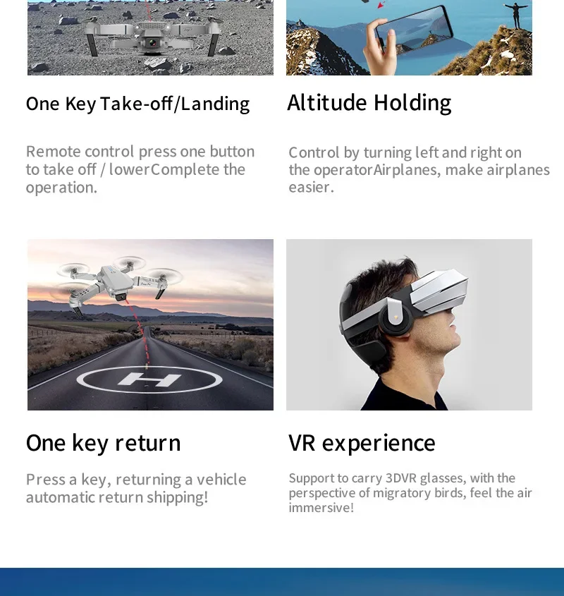 Вверх/вниз, вперед/назад, поворот влево/вправо, боковой полет, 3-уровневая скорость полета, светодиодная подсветка, режим без головы, автоматический возврат одной кнопкой, режим удержания высоты, WiFi FPV, траектория полета, камера/видео
